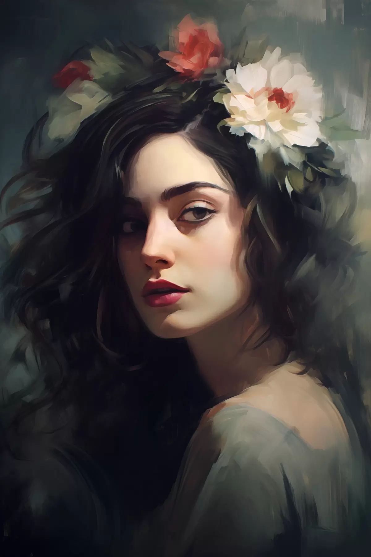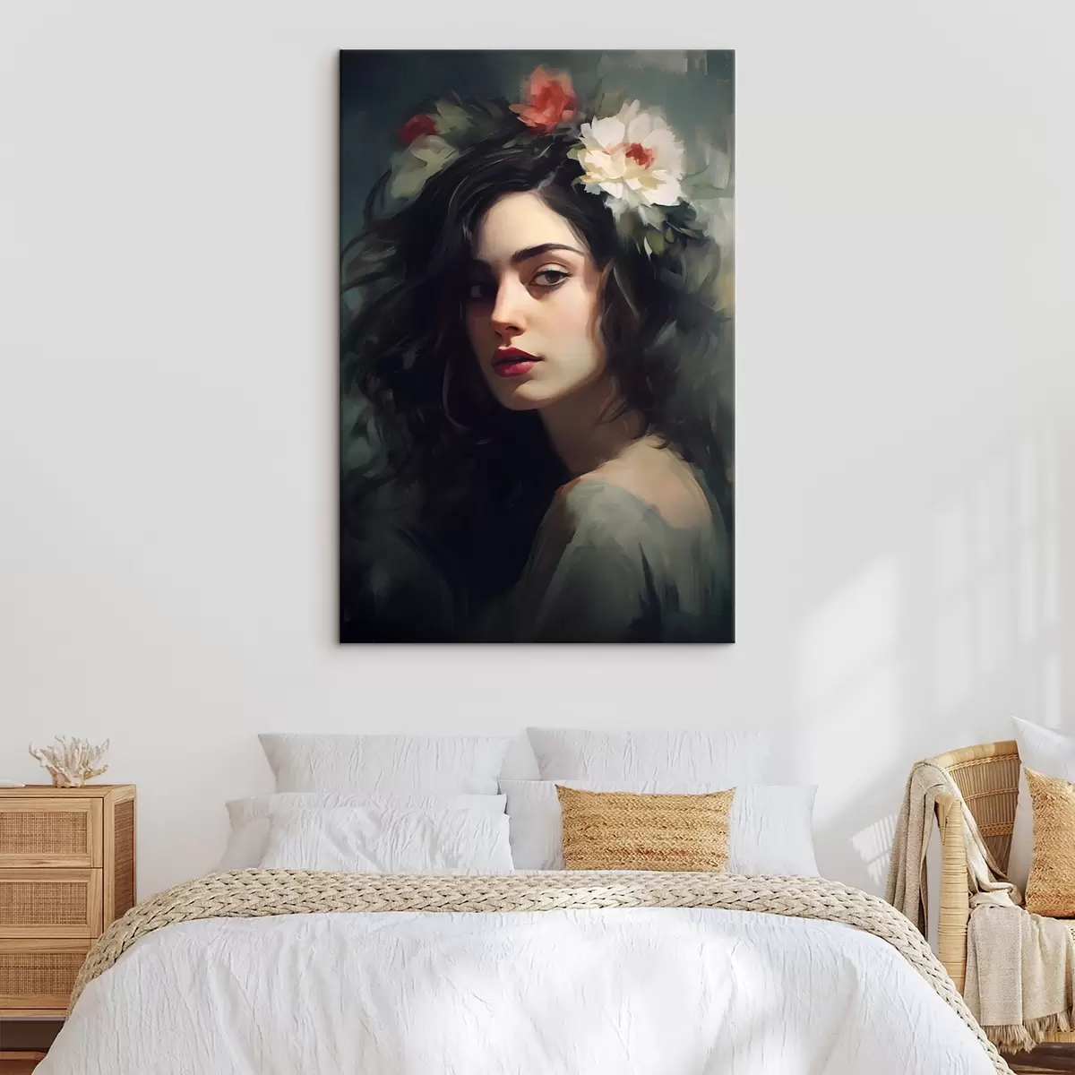 Glezna Tumšmataina sieviete ar ziedu vainagu s44762