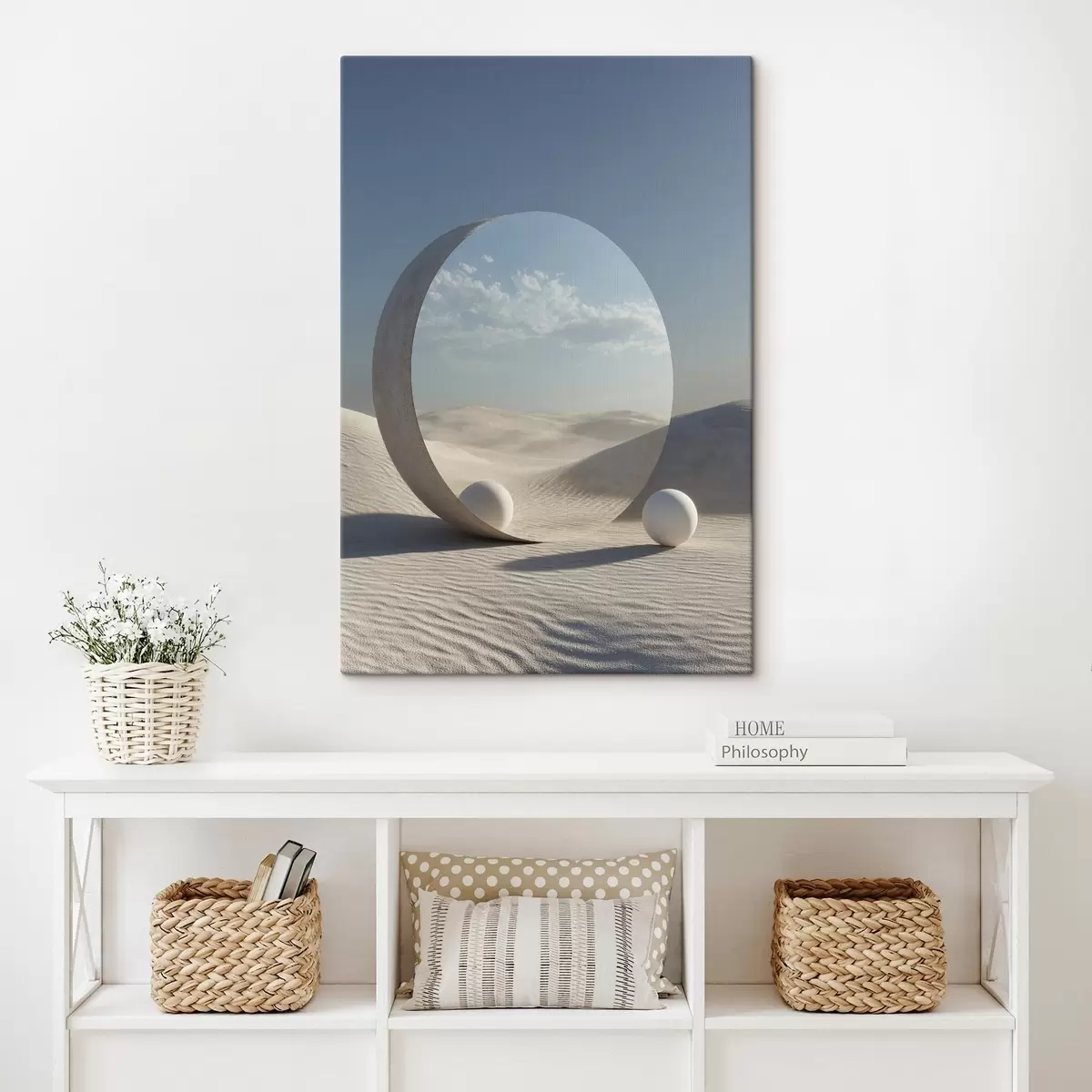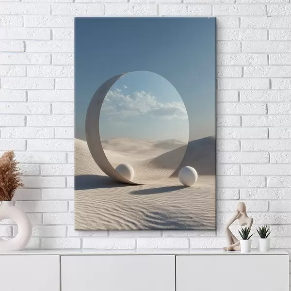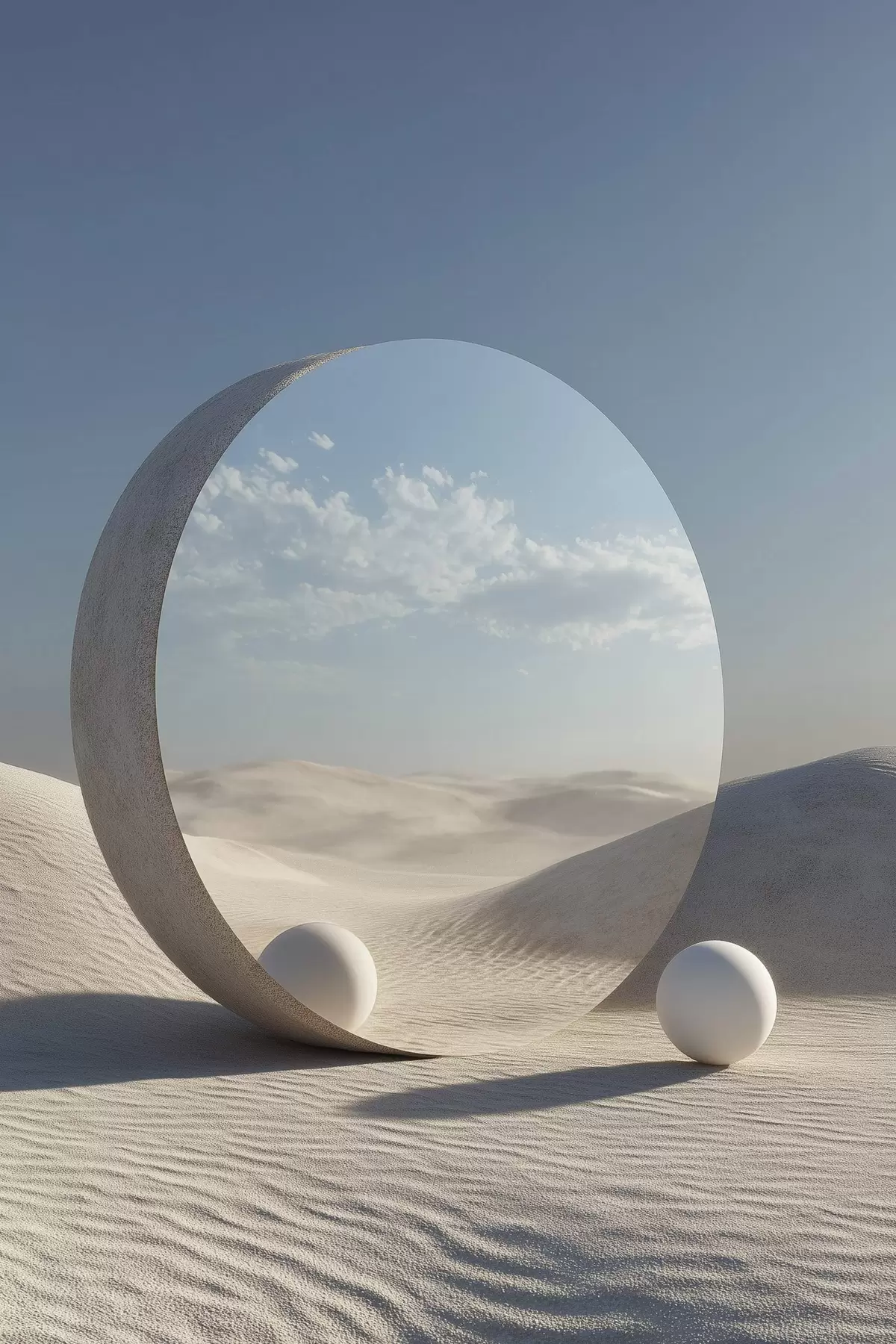 Glezna Sirreāla tuksneša ainava ar apaļu spoguli, kas atspoguļo debesis un mēnesi Nr s44792