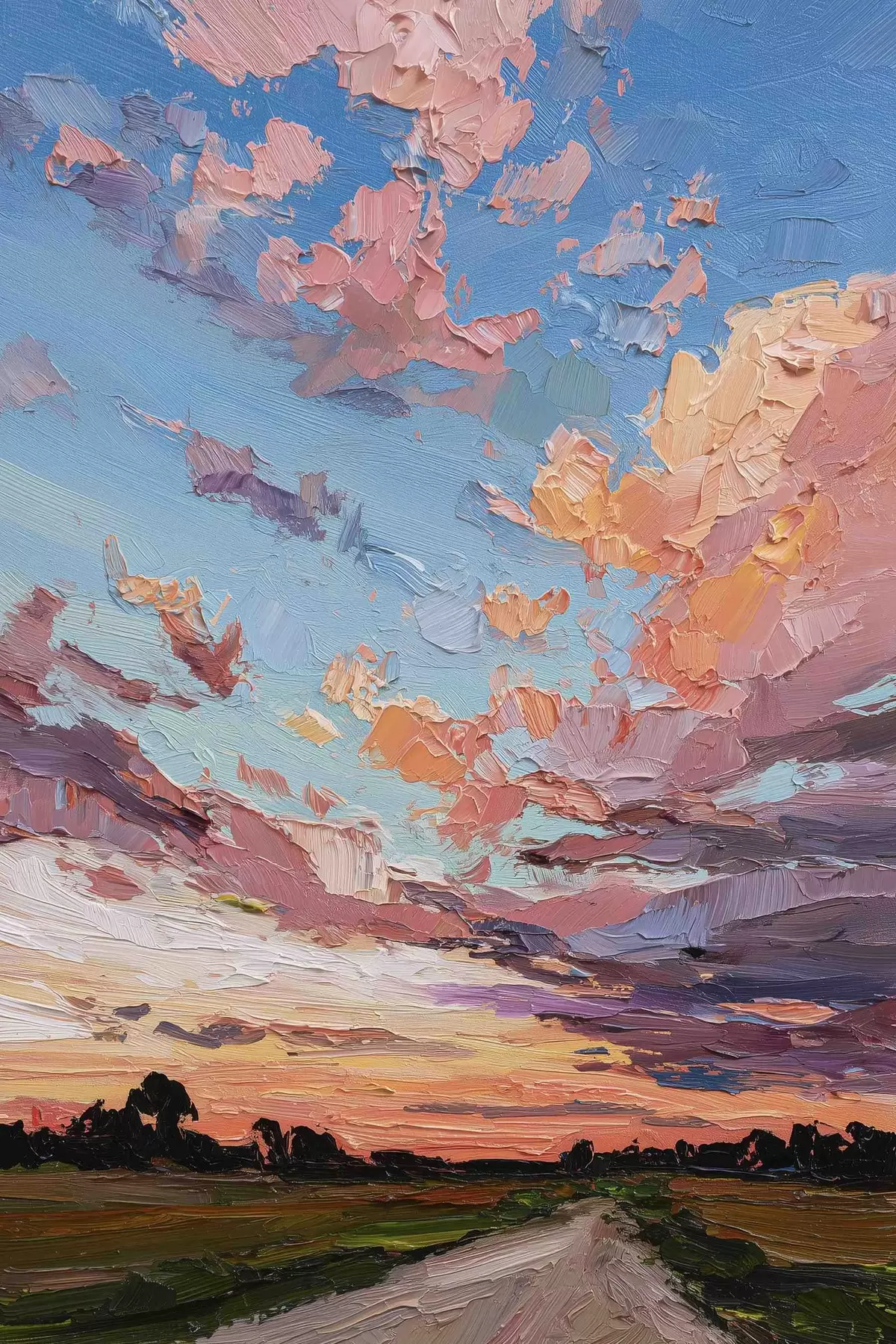 Glezna Saulrieta debesis, ceļš laukā, spilgti triepieni ar otu, eļļas stila imitācija Nr s44795