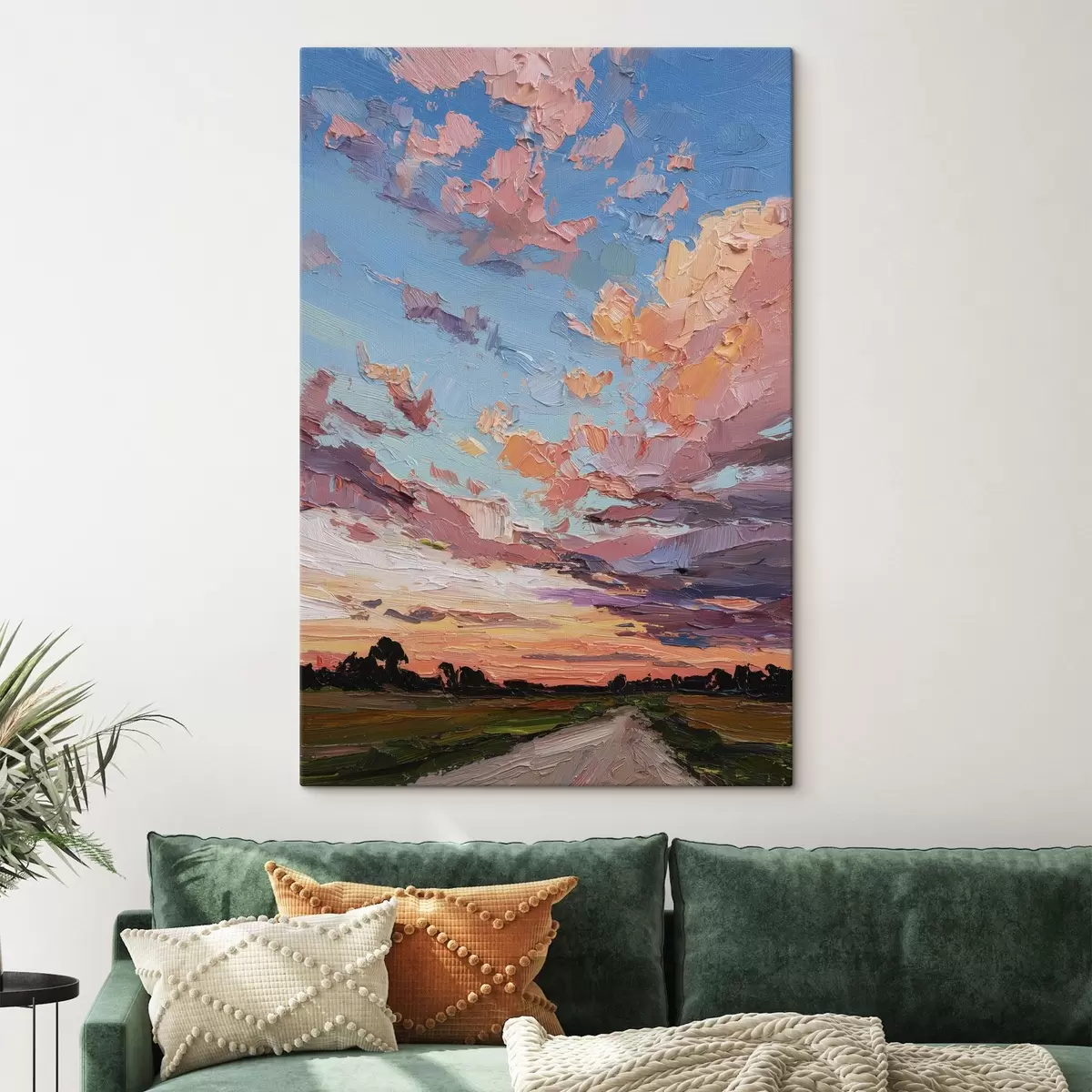 Glezna Saulrieta debesis, ceļš laukā, spilgti triepieni ar otu, eļļas stila imitācija  s44795
