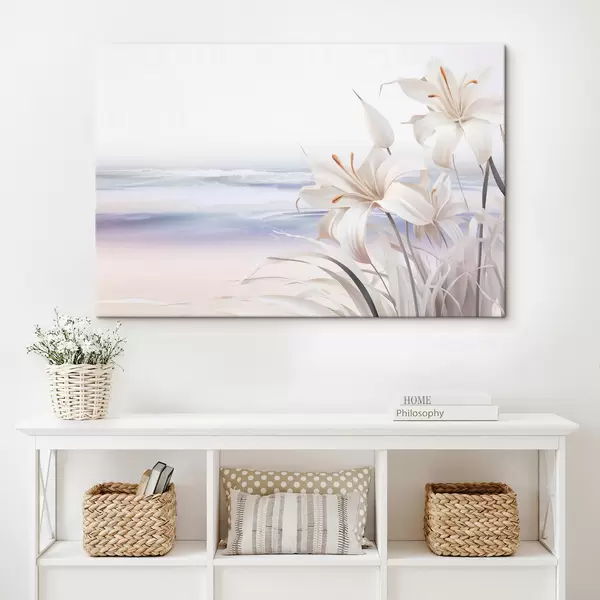 Glezna Baltas lilijas ar oranžiem augļlapiņām un garām lapām pludmalē ar mīkstiem viļņiem fonā, pasteļtoņos s44850