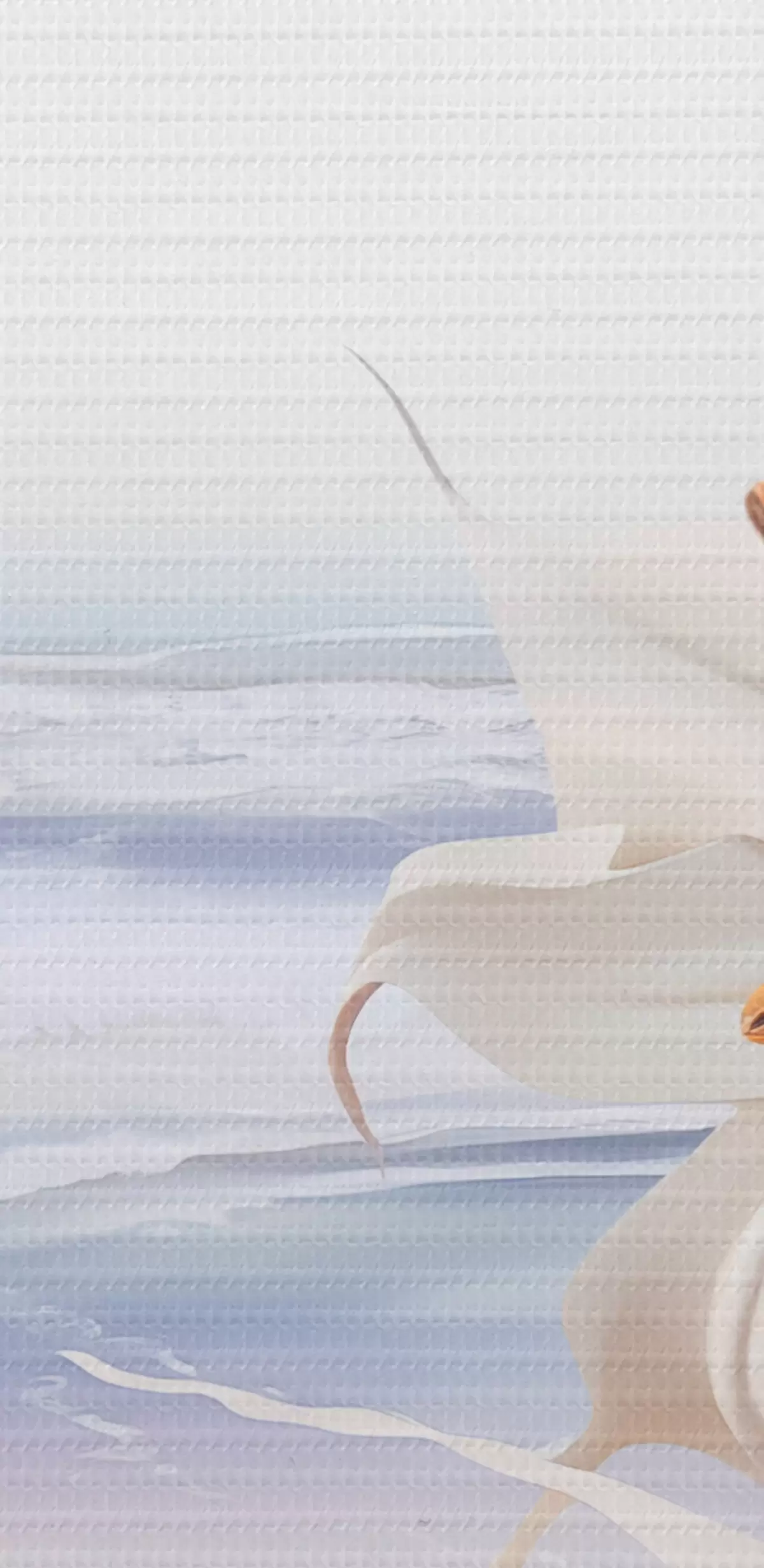 Glezna Baltas lilijas ar oranžiem augļlapiņām un garām lapām pludmalē ar mīkstiem viļņiem fonā, pasteļtoņos Nr s44850