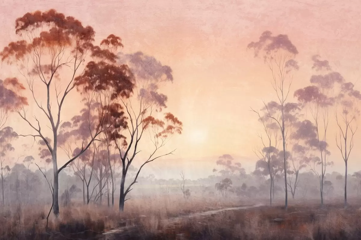 Glezna Ainavu glezna, kurā attēlots lauks ar augstu zāli un kokiem, fonā redzama saule Nr s44854