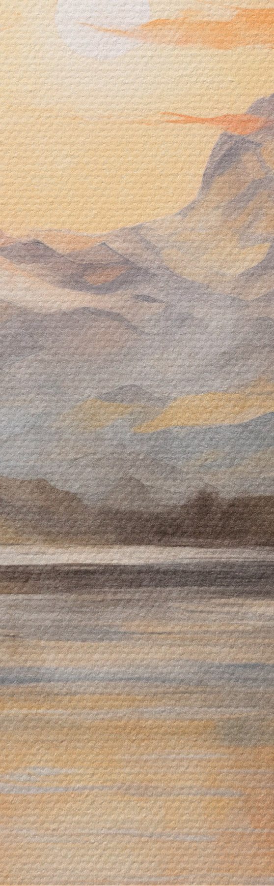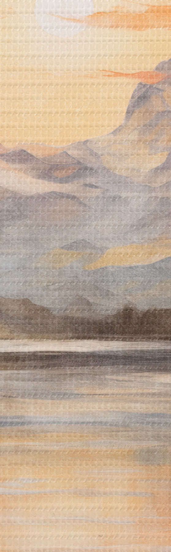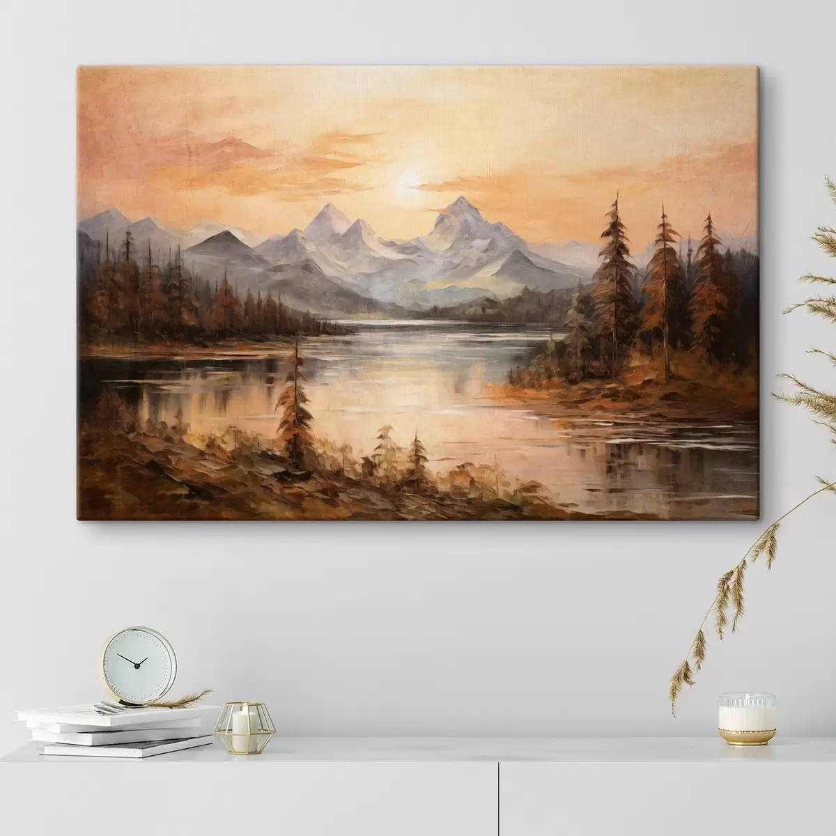 Glezna Ainava ar ezeru, ko ieskauj koki un kalni fonā, oranžas debesis ar sauli  s44857