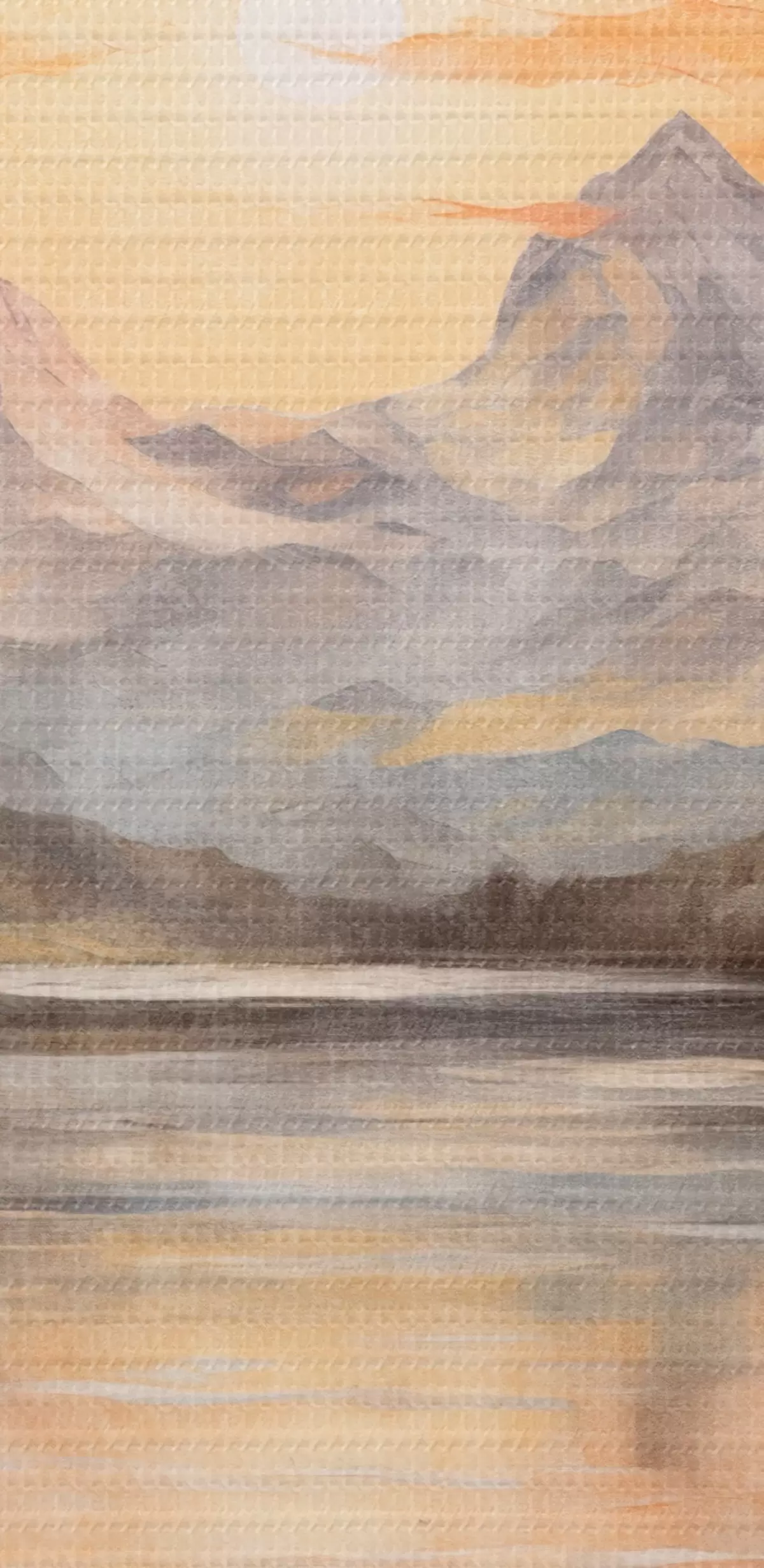 Glezna Ainava ar ezeru, ko ieskauj koki un kalni fonā, oranžas debesis ar sauli  s44857