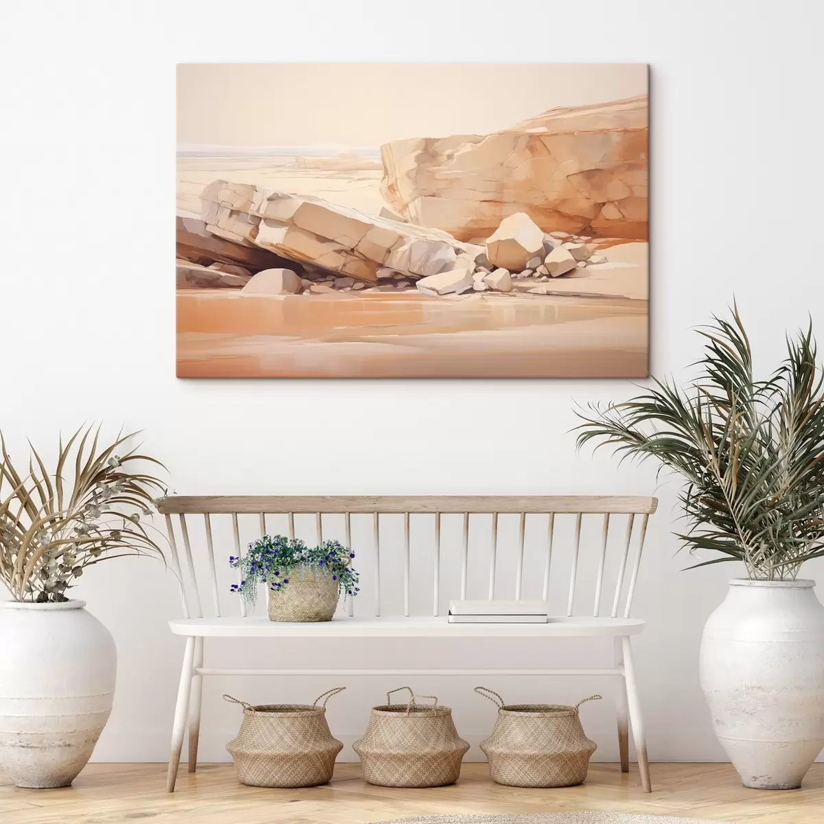 Glezna Minimālistiska akmeņaina pludmales ainava ar lieliem gaiši brūniem laukakmeņiem un dzidru ūdeni Nr s44865