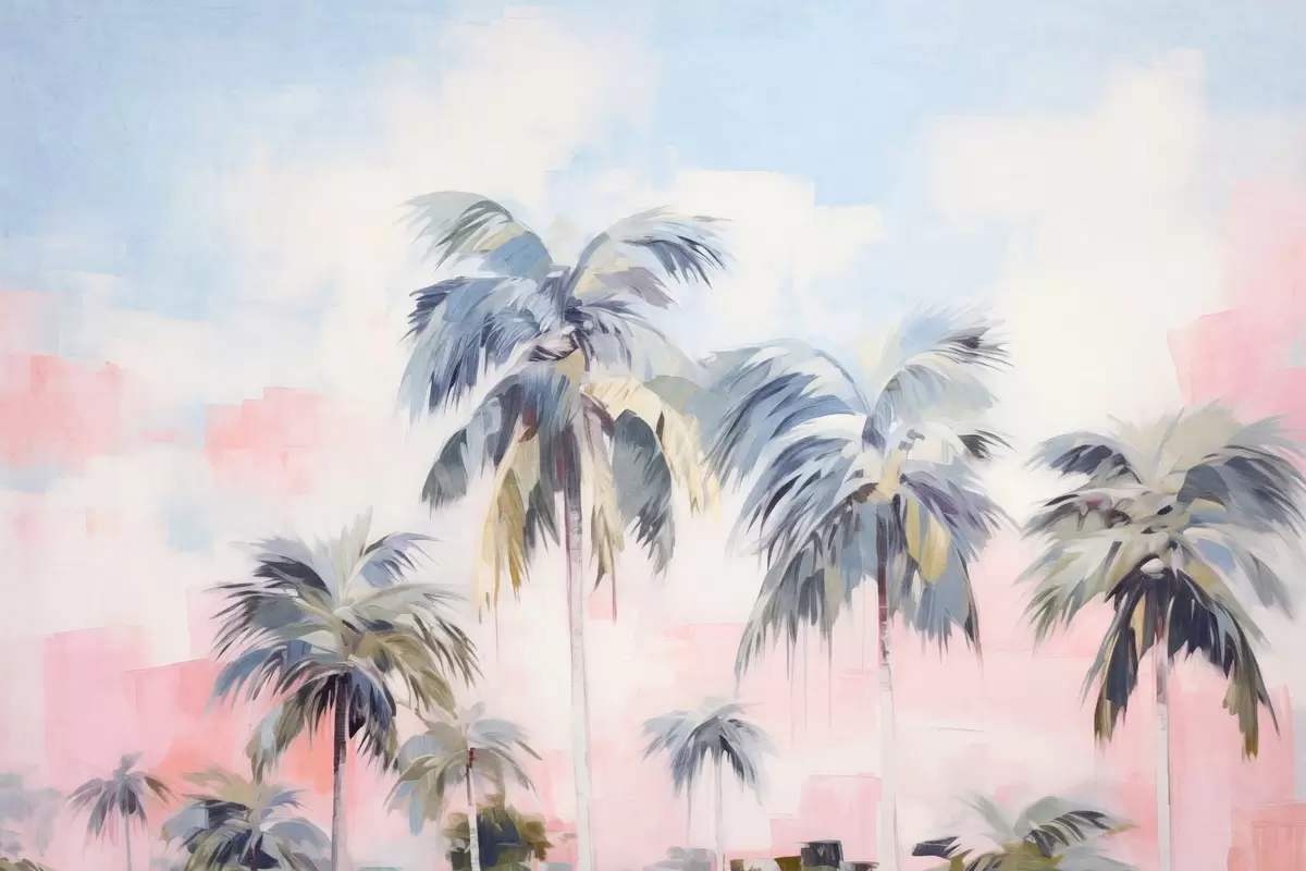 Glezna Palmas ar pasteļkrāsas lapām un brūniem stumbriem, rozā un zilas debesis, tropu vide Nr s44866