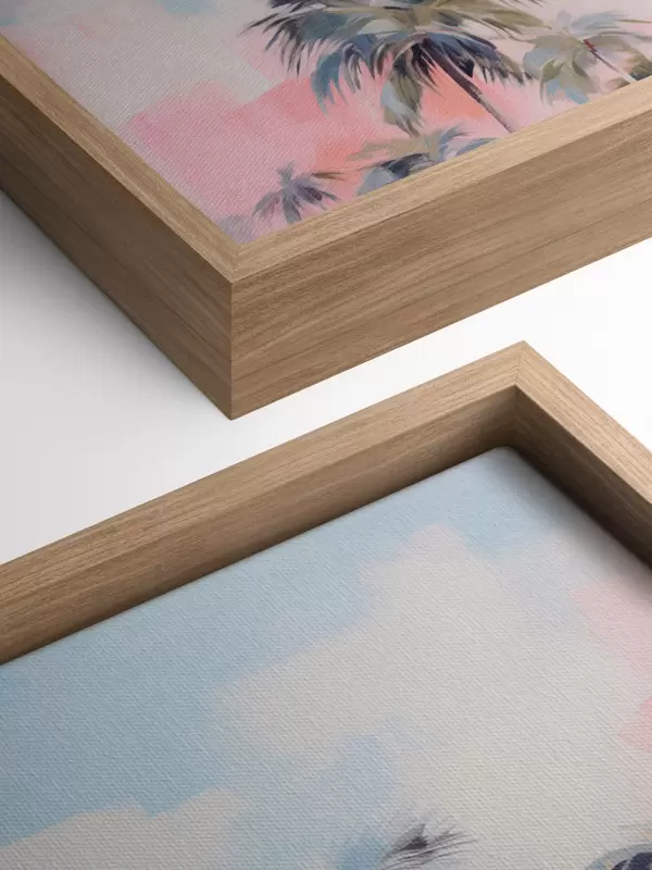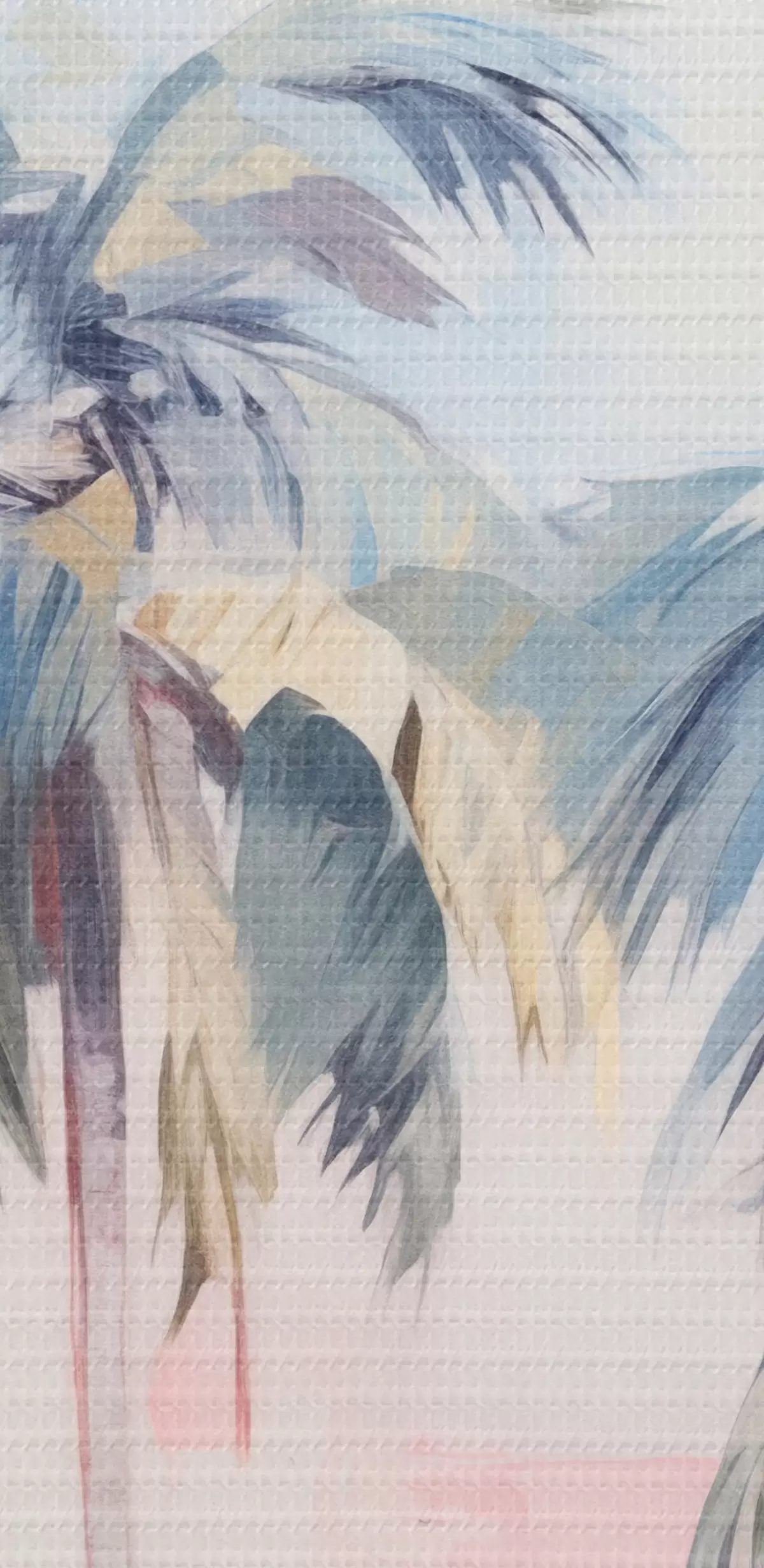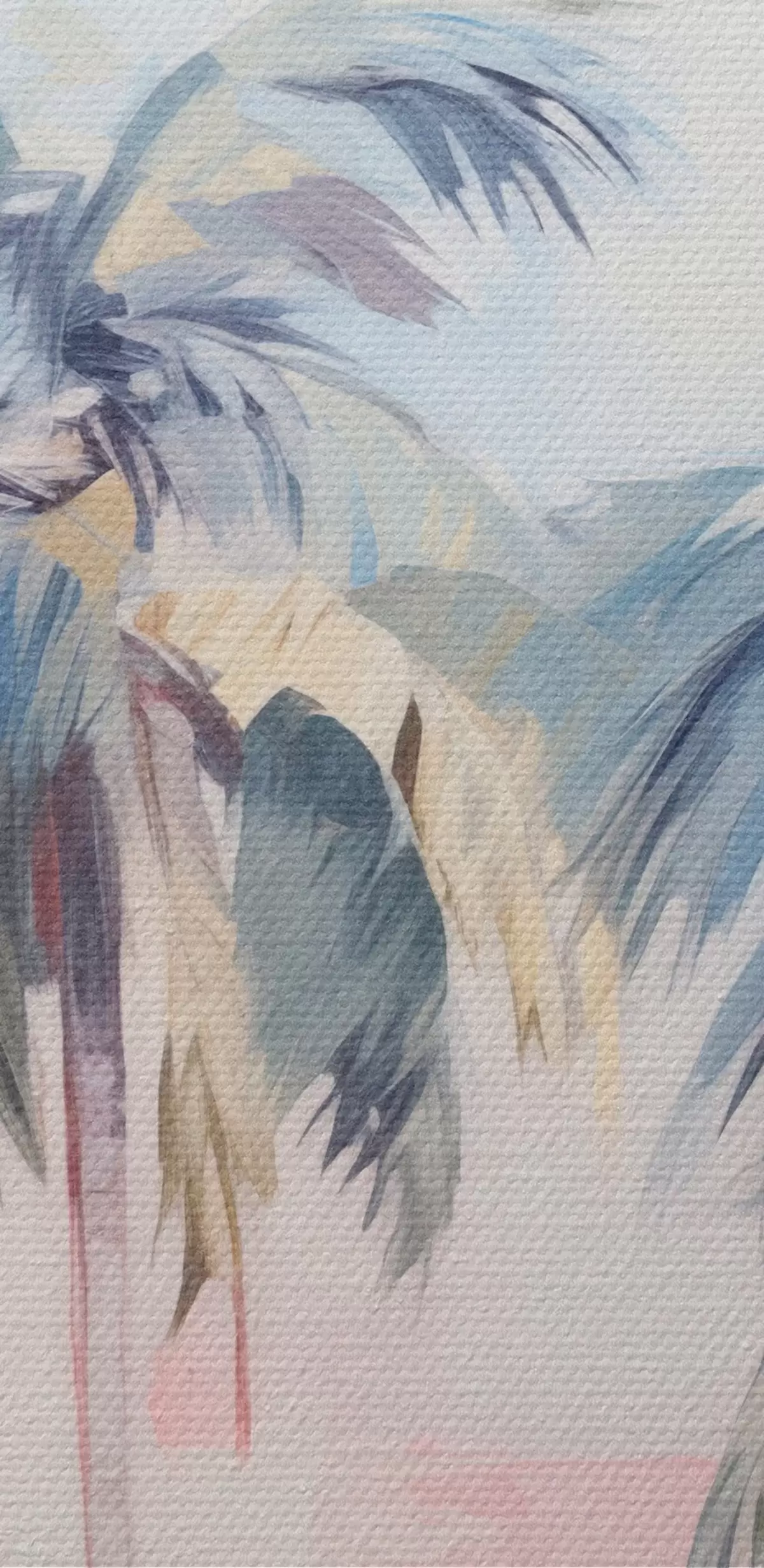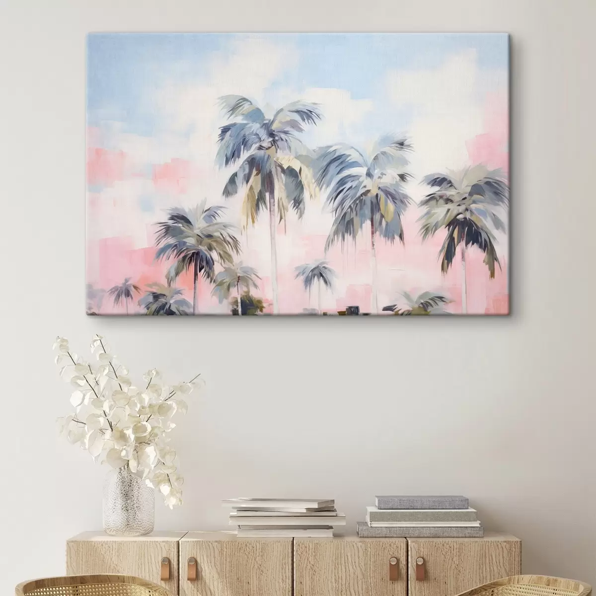 Glezna Palmas ar pasteļkrāsas lapām un brūniem stumbriem, rozā un zilas debesis, tropu vide  s44866