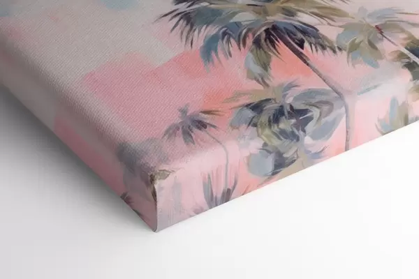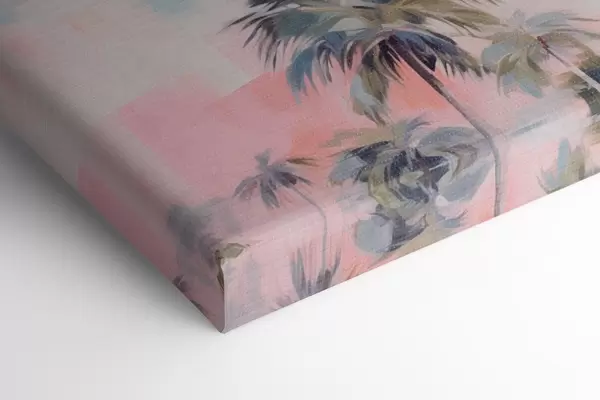 Glezna Palmas ar pasteļkrāsas lapām un brūniem stumbriem, rozā un zilas debesis, tropu vide  s44866