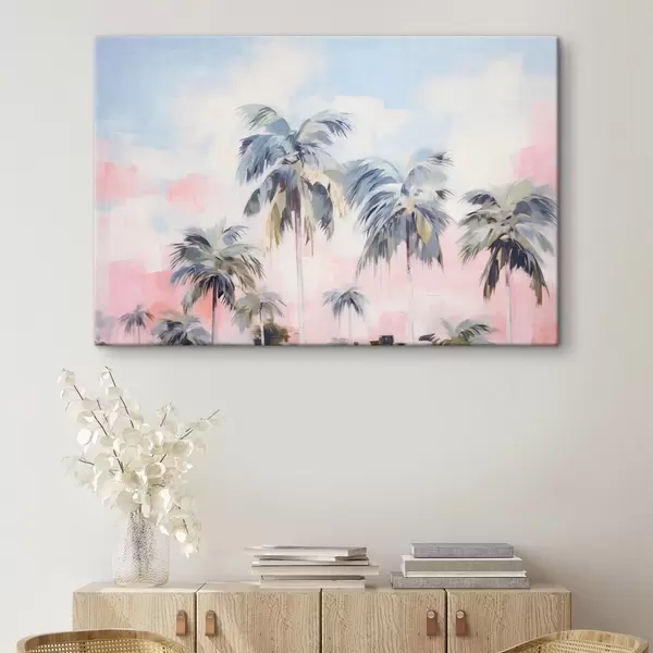 Glezna Palmas ar pasteļkrāsas lapām un brūniem stumbriem, rozā un zilas debesis, tropu vide Nr s44866
