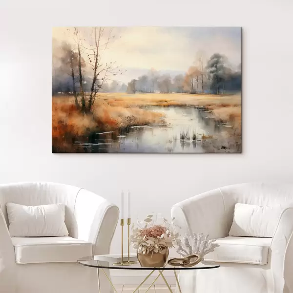 Glezna Mierīga fakturēta ainavas glezniecības imitācija ar niedrēm un kailiem kokiem, mierīgs ūdens zem debesīm Nr s44867