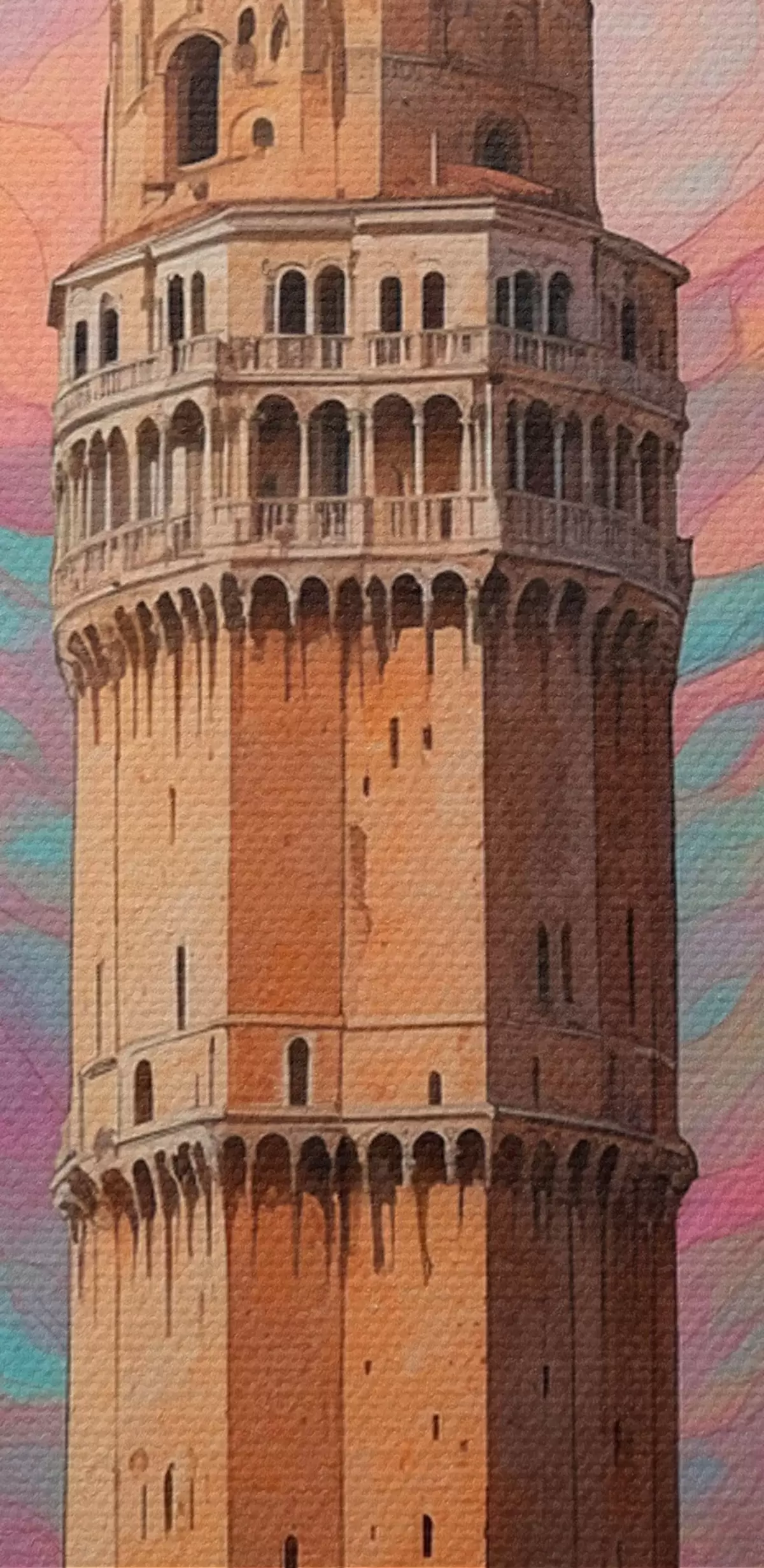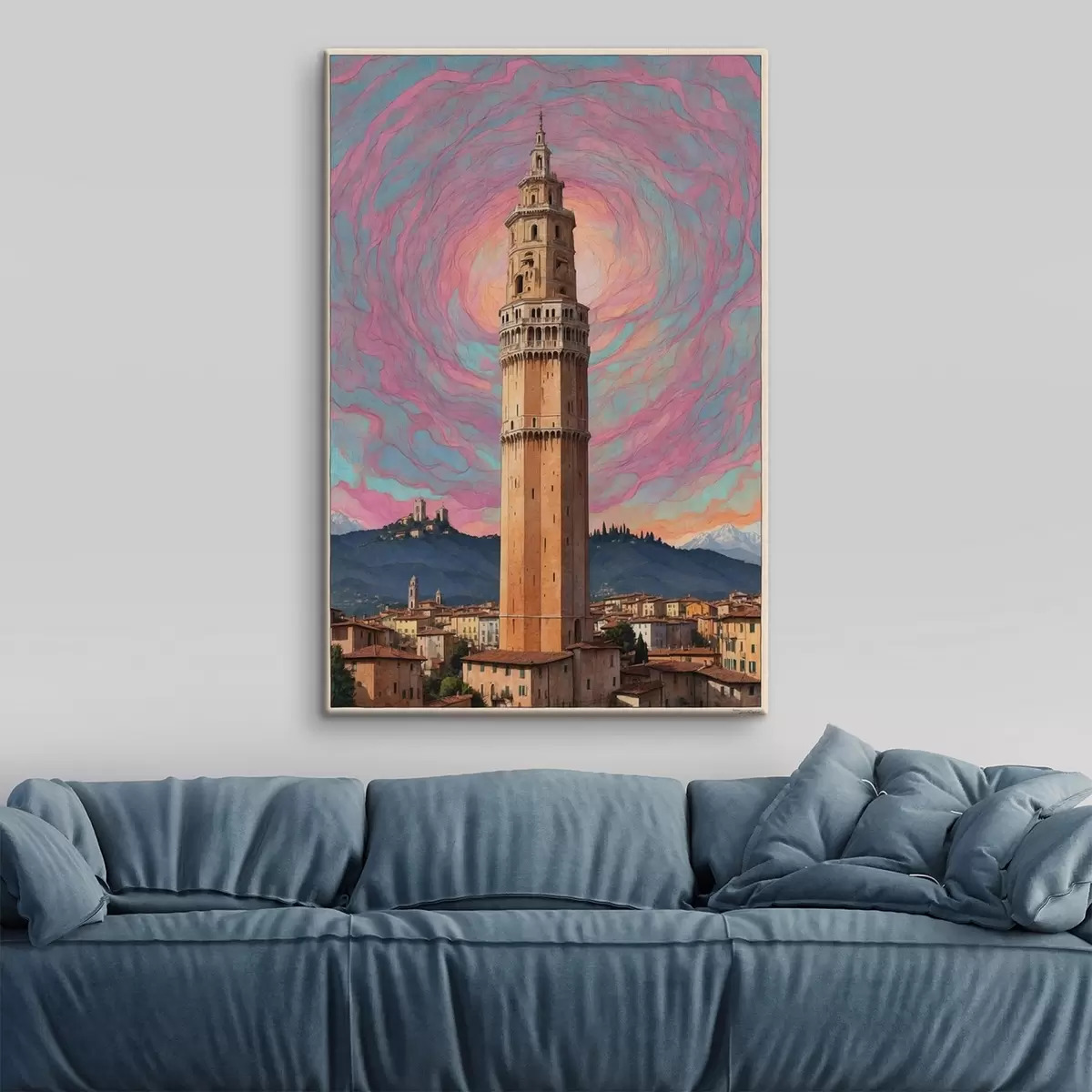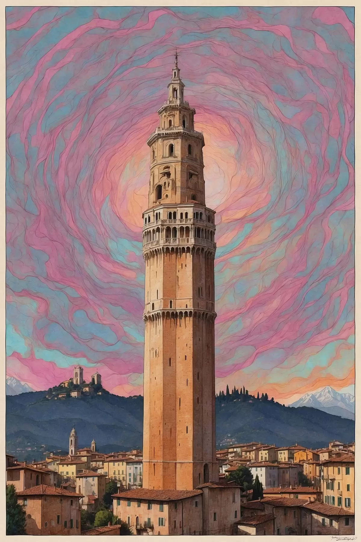 Glezna Fantāzijas tornis pret debesīm ar rozā un zilām spirālēm Nr s44885