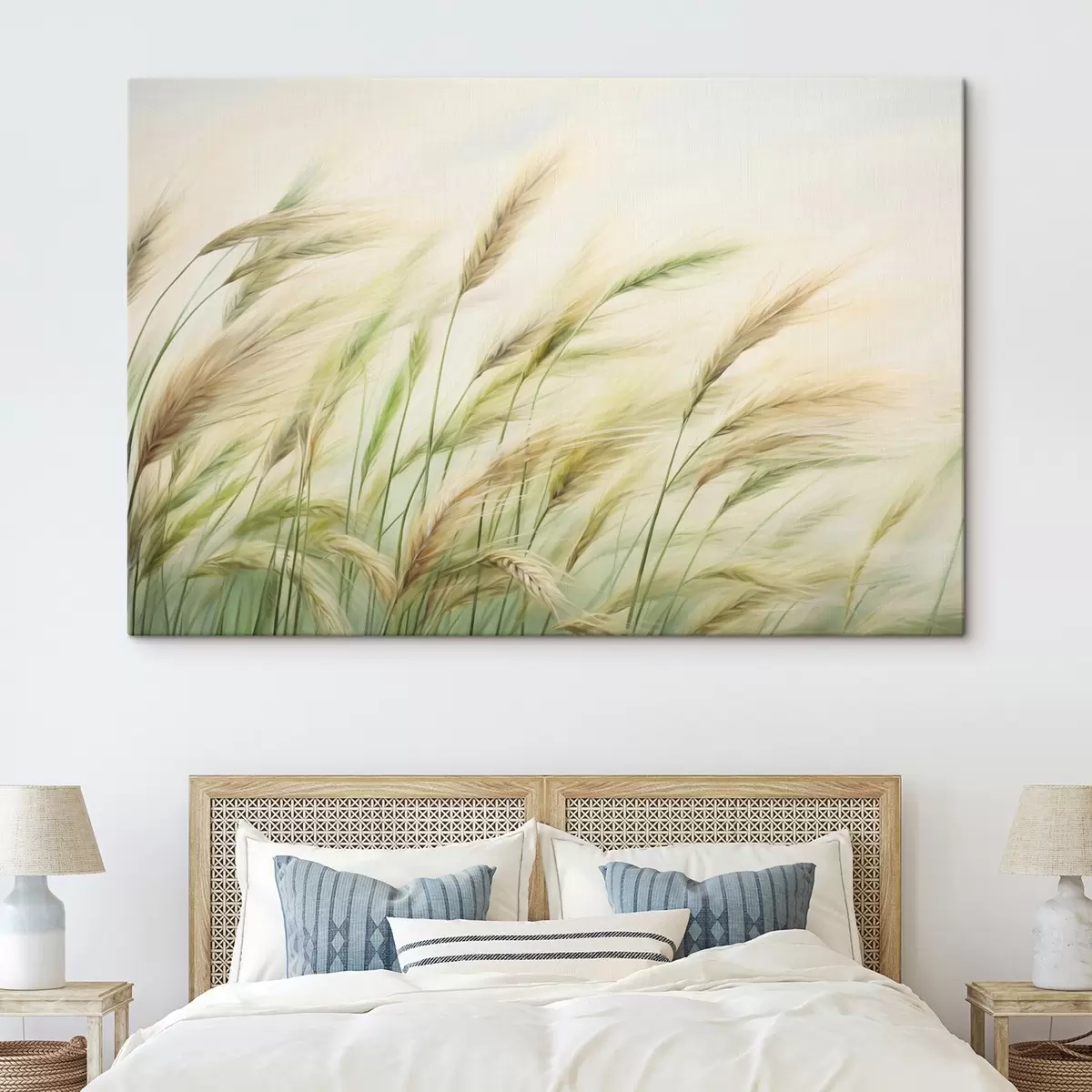 Glezna Kviešu lauks ar dzelteniem un zaļiem graudu graudiem, maigi triepieni un viegla krāsu palete, dabiska atmosfēra Nr s44923