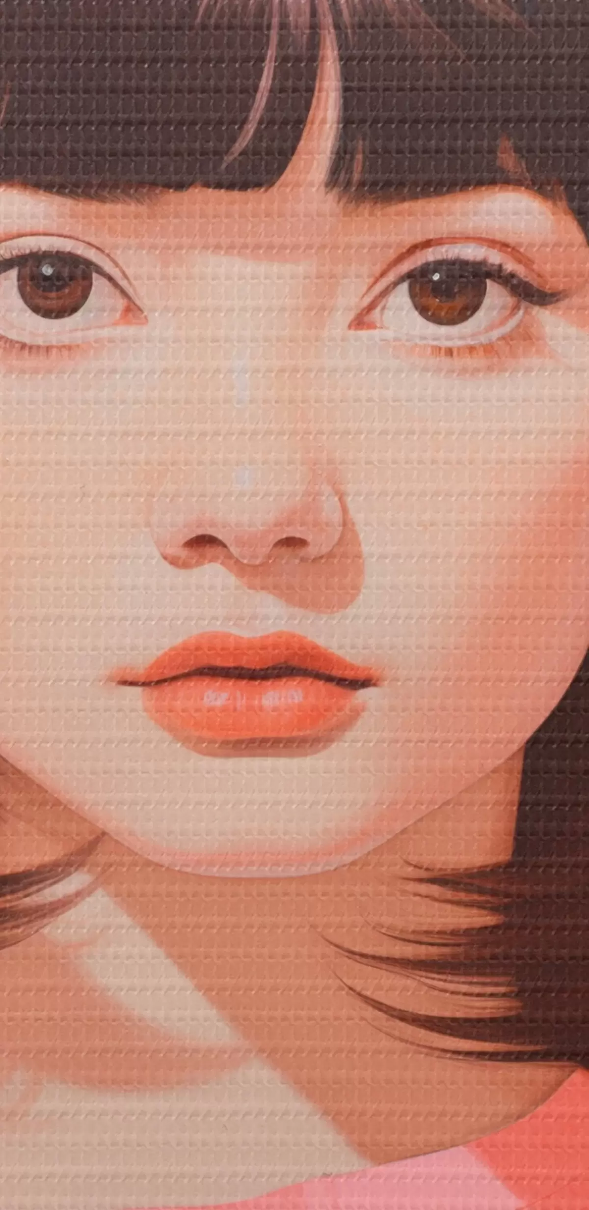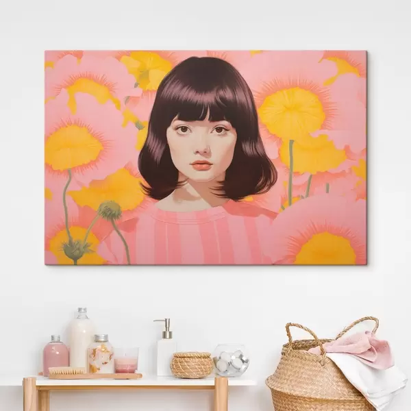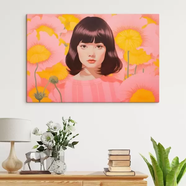 Glezna Dekoratīvs minimālisma stilā veidots aziātu meitenes portrets dzeltenu un rozā ziedu laukā Nr s44924