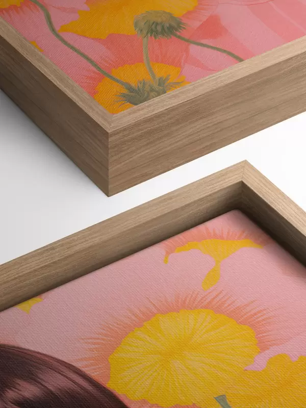 Glezna Dekoratīvs minimālisma stilā veidots aziātu meitenes portrets dzeltenu un rozā ziedu laukā s44924