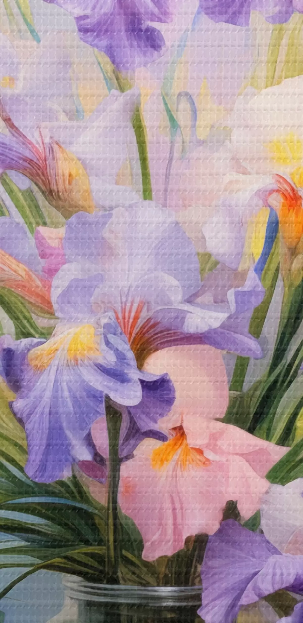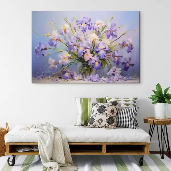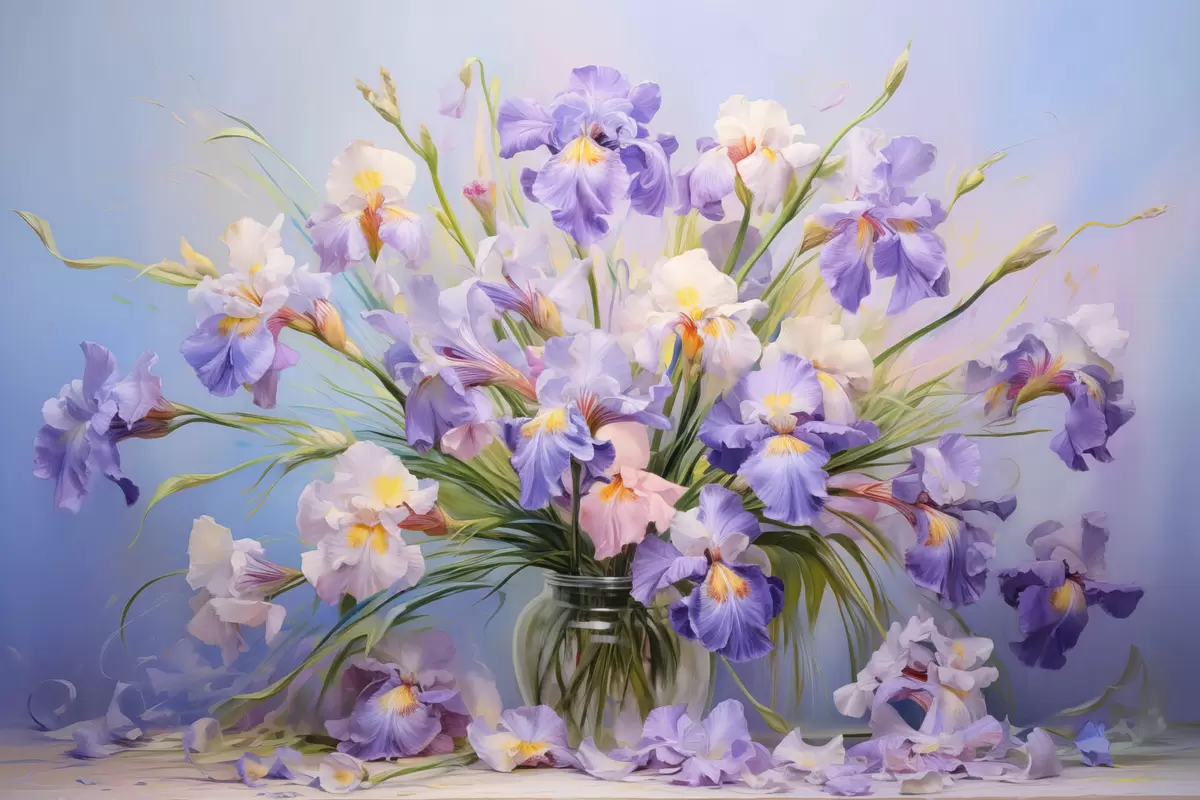 Glezna Vāze ar daudzām pasteļkrāsas īrisiem, dažas ziedlapiņas izkaisītas uz galda, mīksts pasteļtoņu fons ar ziliem un rozā toņiem Nr s44933