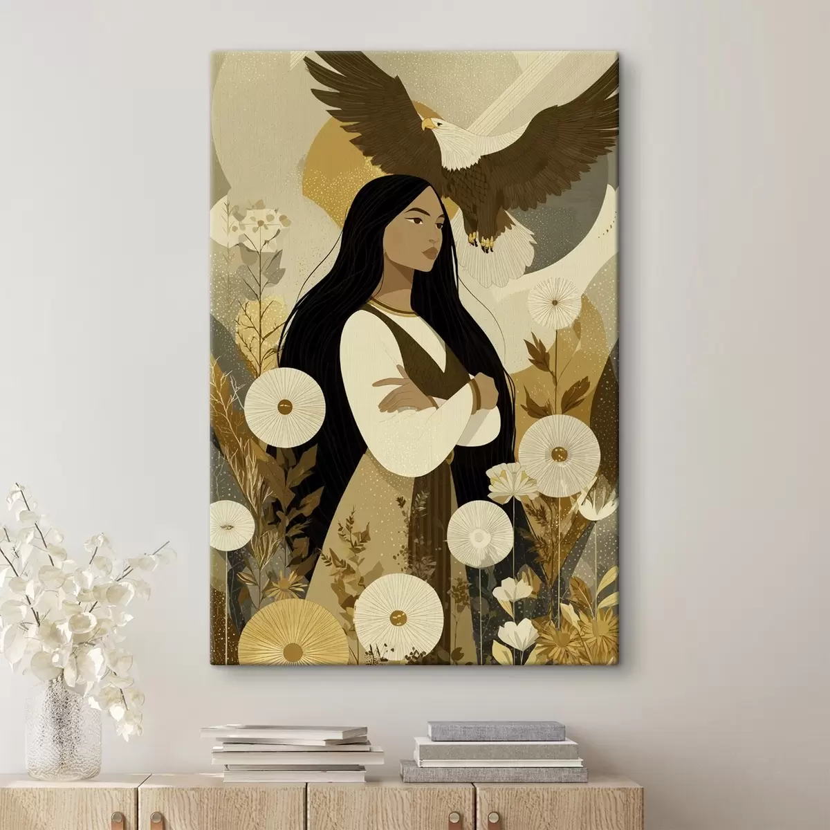 Glezna Sieviete ar lidojošu ērgli, cilšu stilā, bēšas krāsas s44977