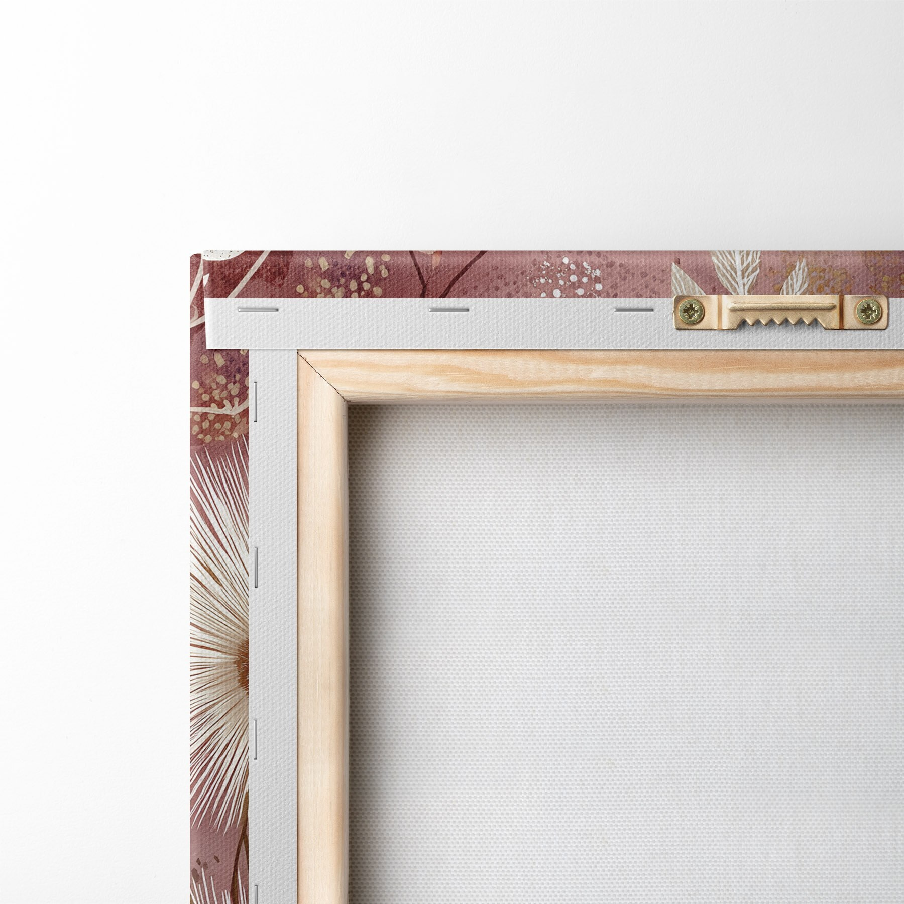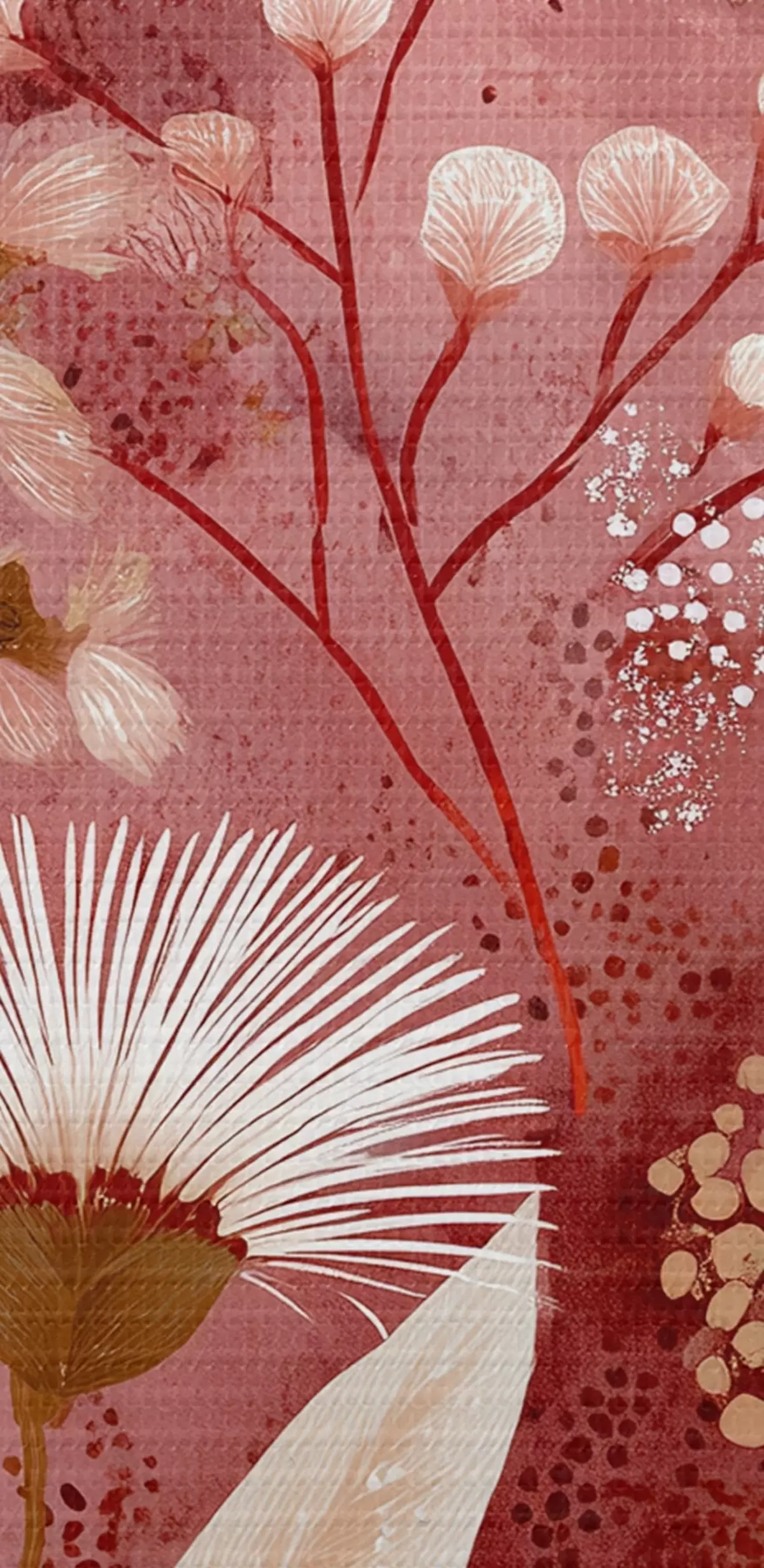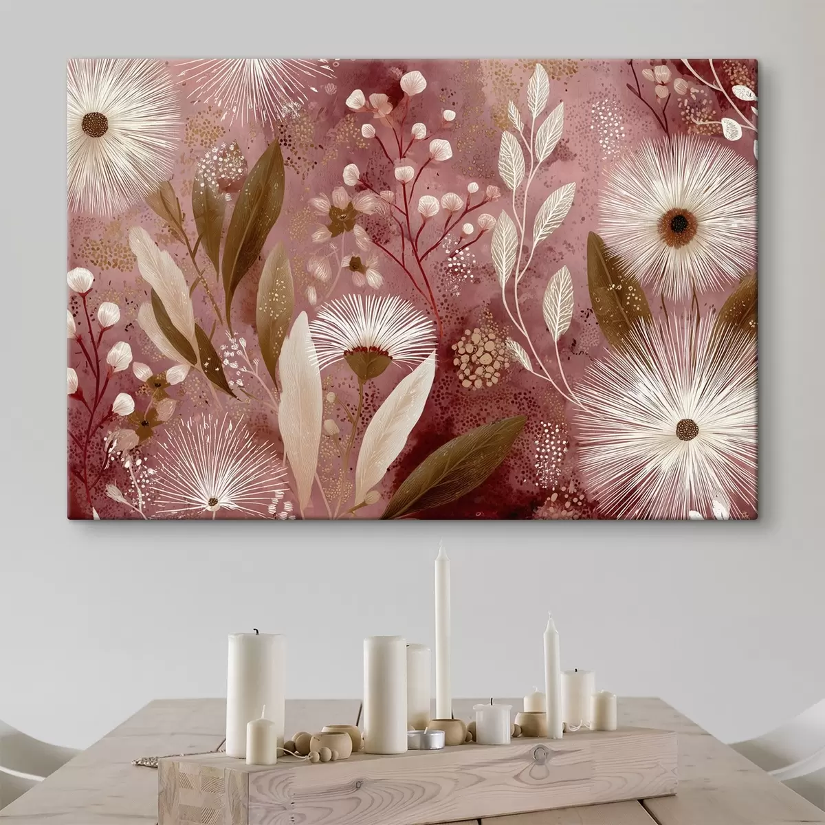 Glezna Boho stila balti ziedi uz sarkana fona, detalizēts zīmējums Nr s44979