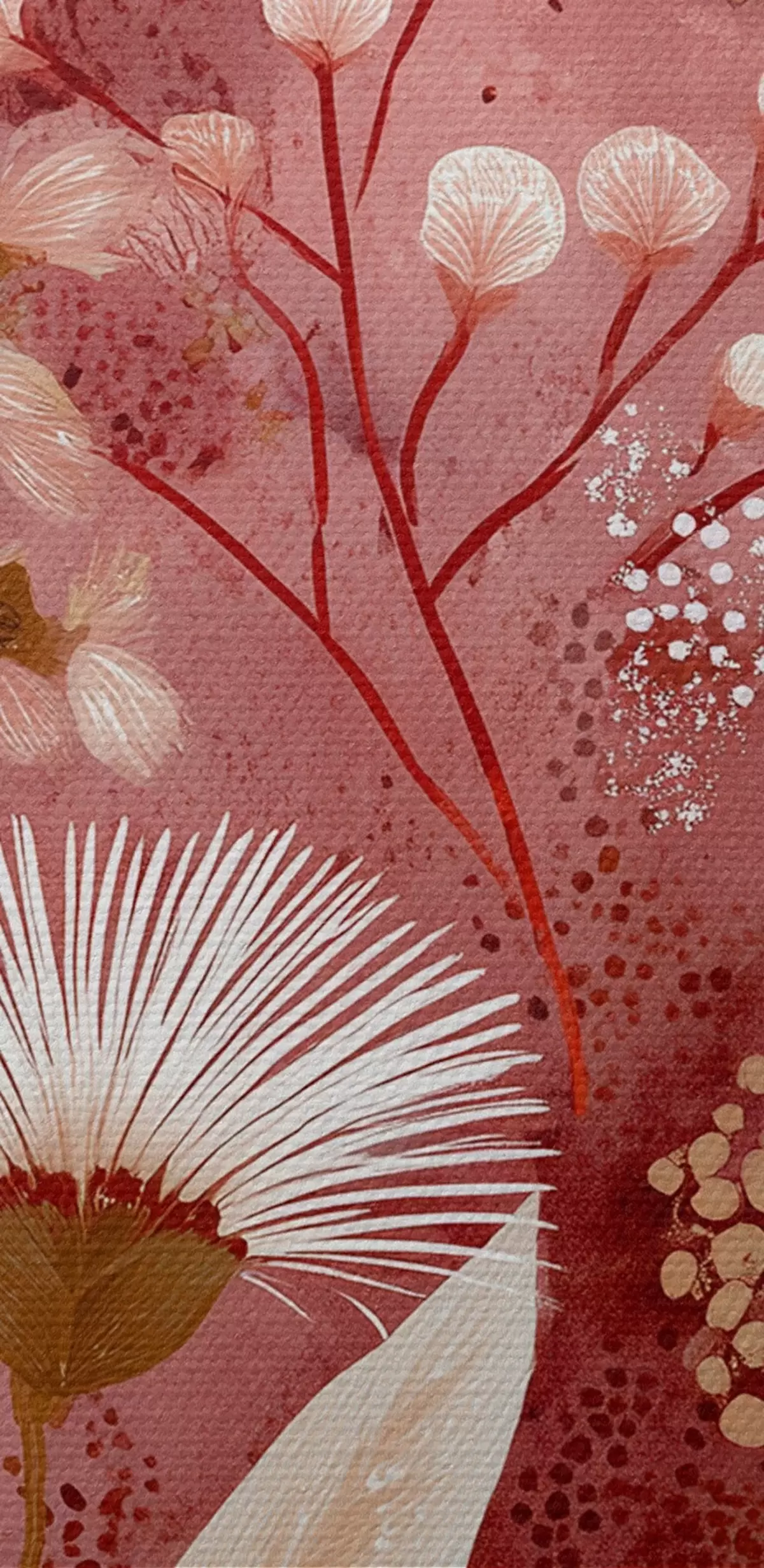 Glezna Boho stila balti ziedi uz sarkana fona, detalizēts zīmējums s44979