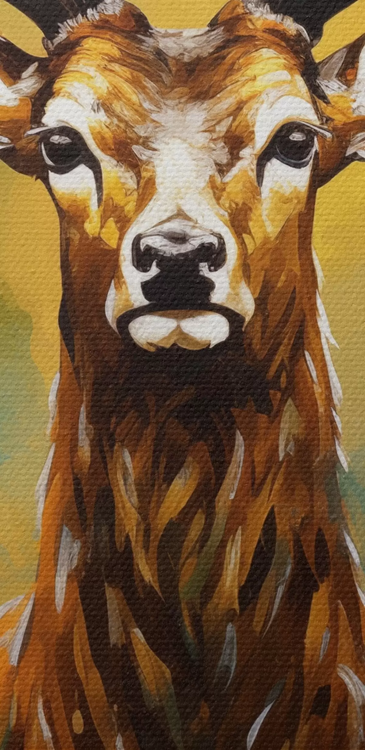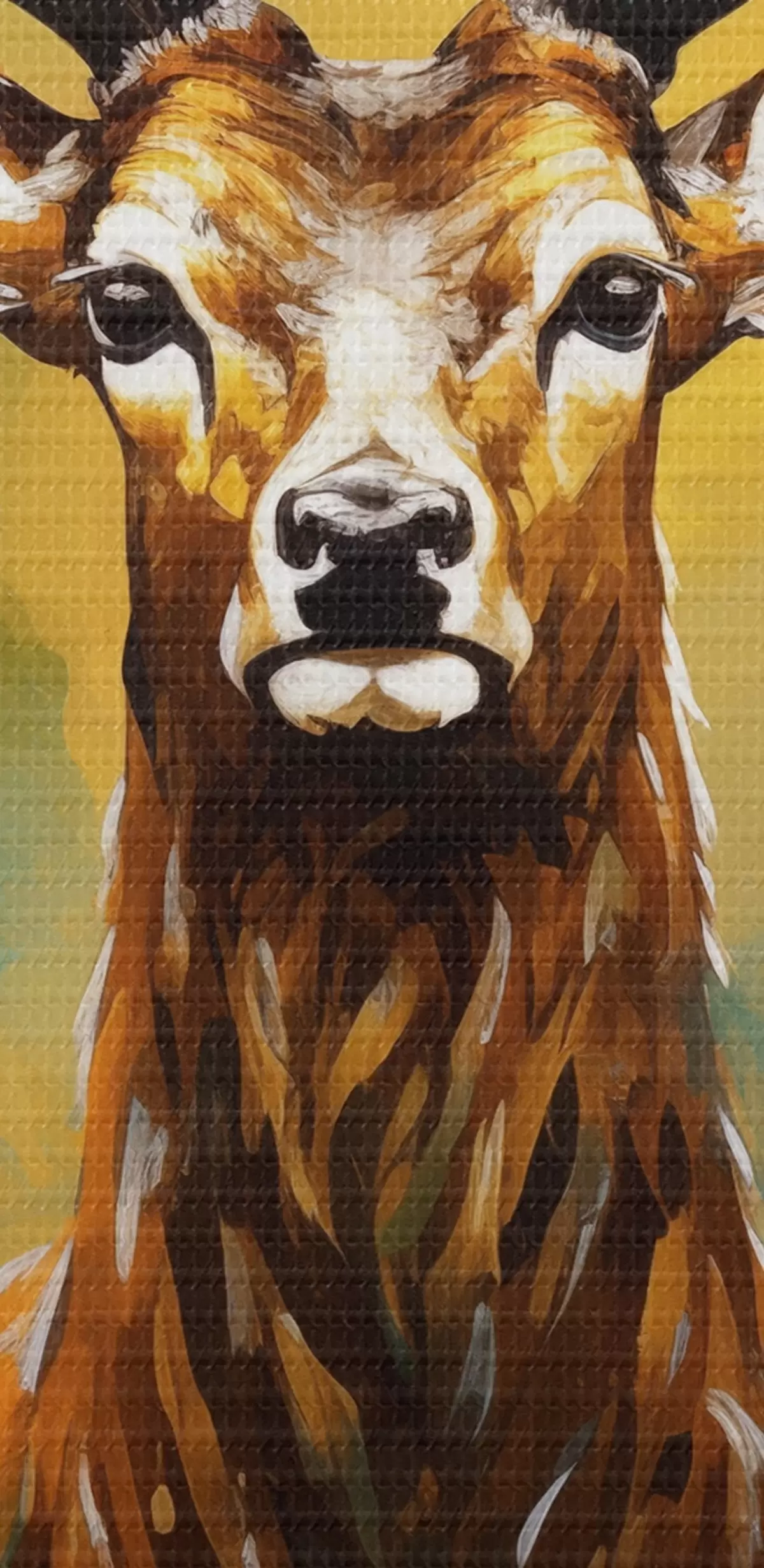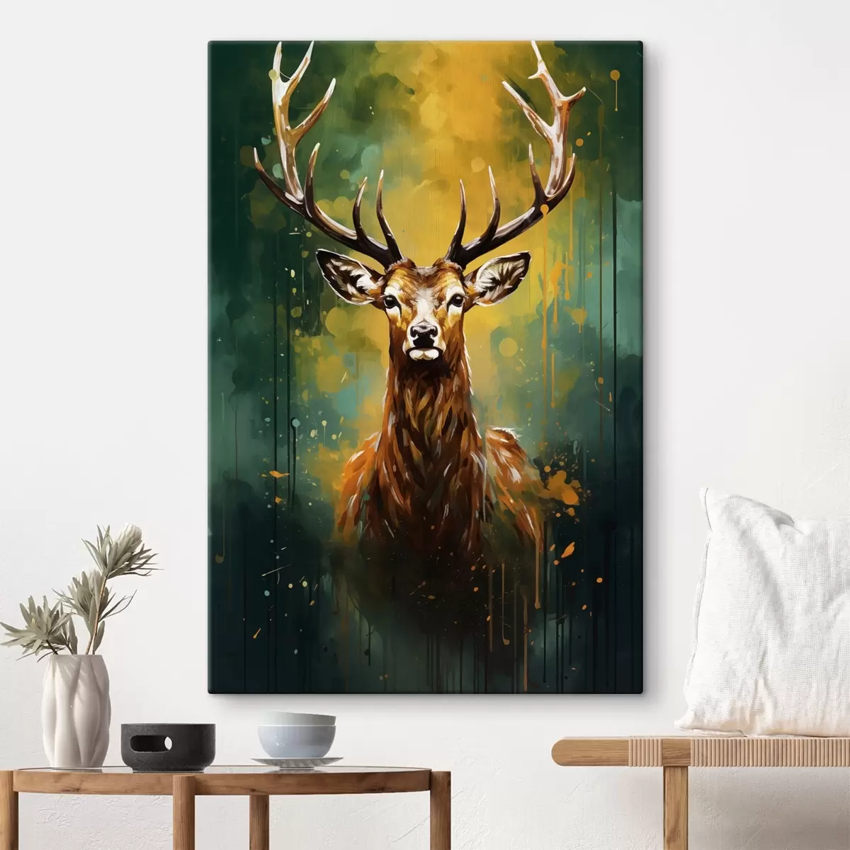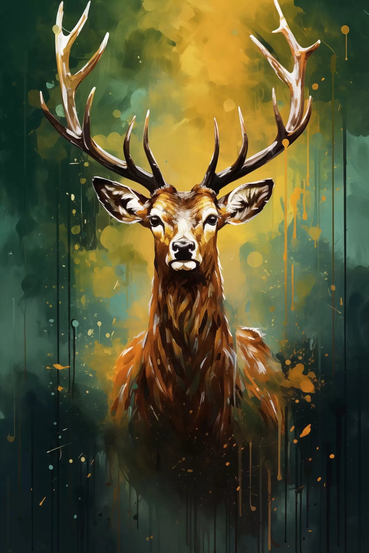 Glezna briedis, ragi, meža zaļš, oranža šļakatas, dzīvnieku portrets, krāsas pilieni, drosmīgs, savvaļas dzīvnieki Nr s45111