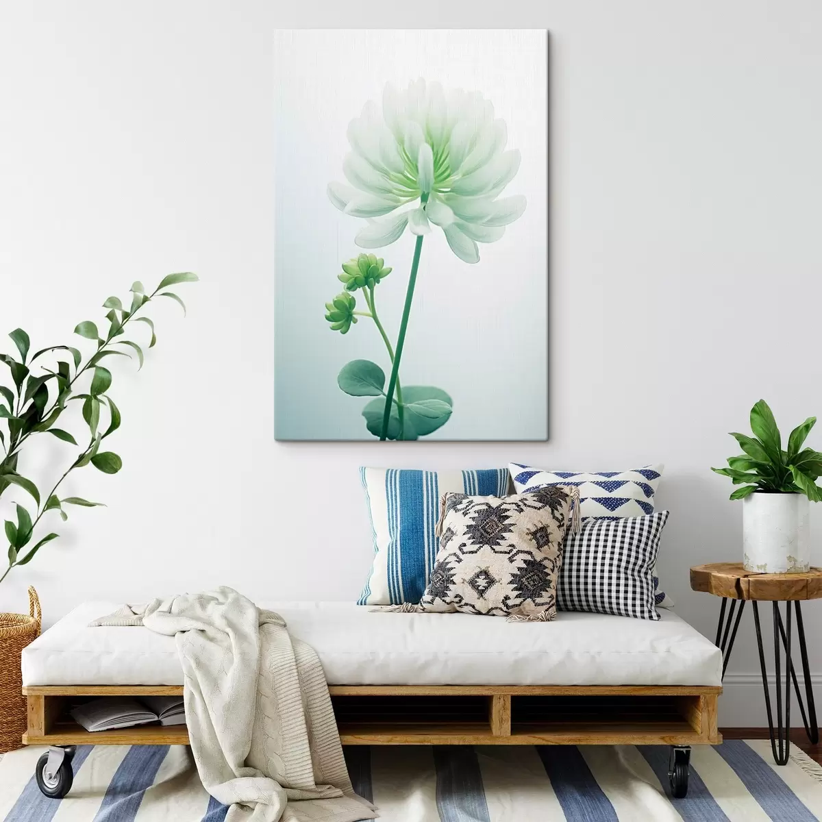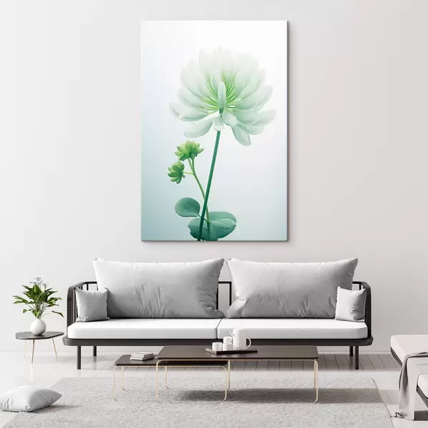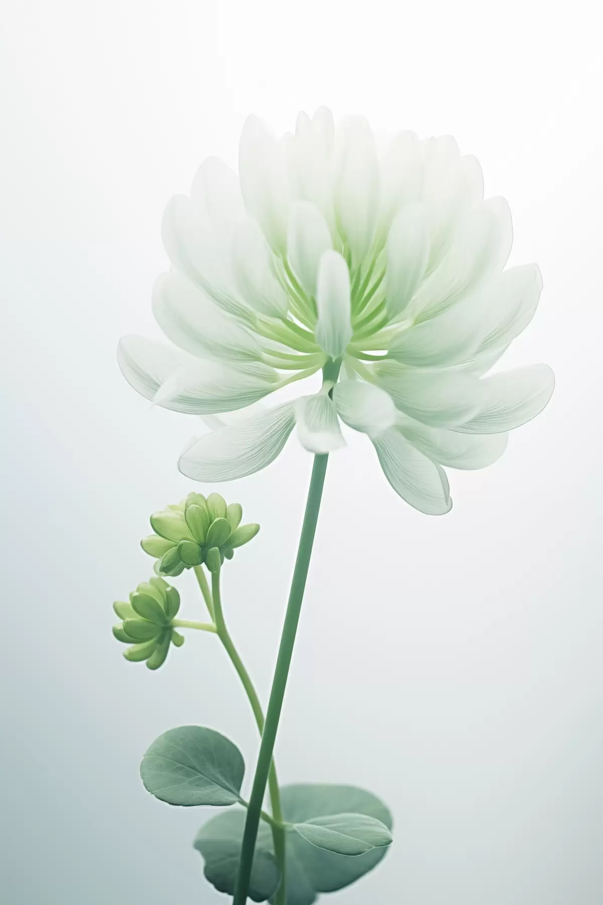 Glezna Balts āboliņa zieds ar zaļu stublāju un lapām, maigs apgaismojums, tīrs fons, minimālisma kompozīcija, botānisks s45171