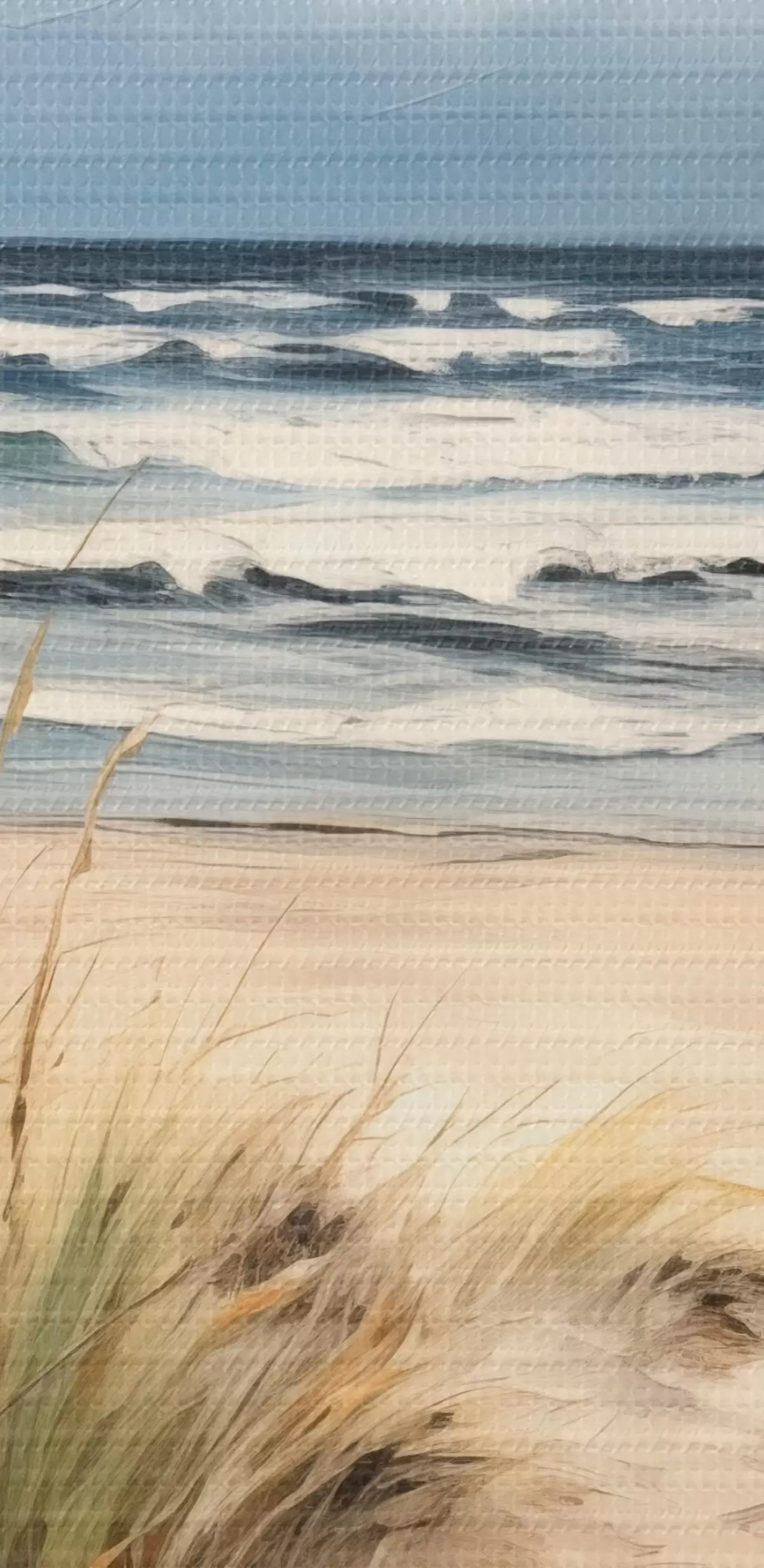 Glezna Smilšaina pludmale ar augstu zāli priekšplānā, okeāns ar viļņiem un mākoņainas debesis fonā Nr s45173
