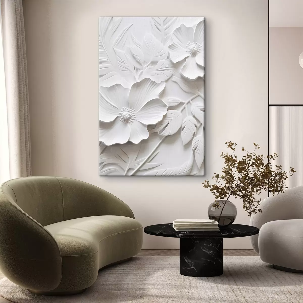 Glezna Dekoratīvi minimālisma stilā veidoti balti ziedi ar lapām, reljefa imitācija, balts fons Nr s45180