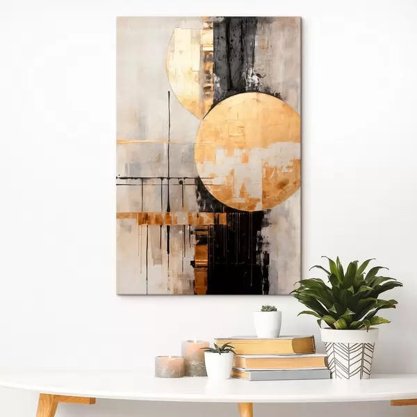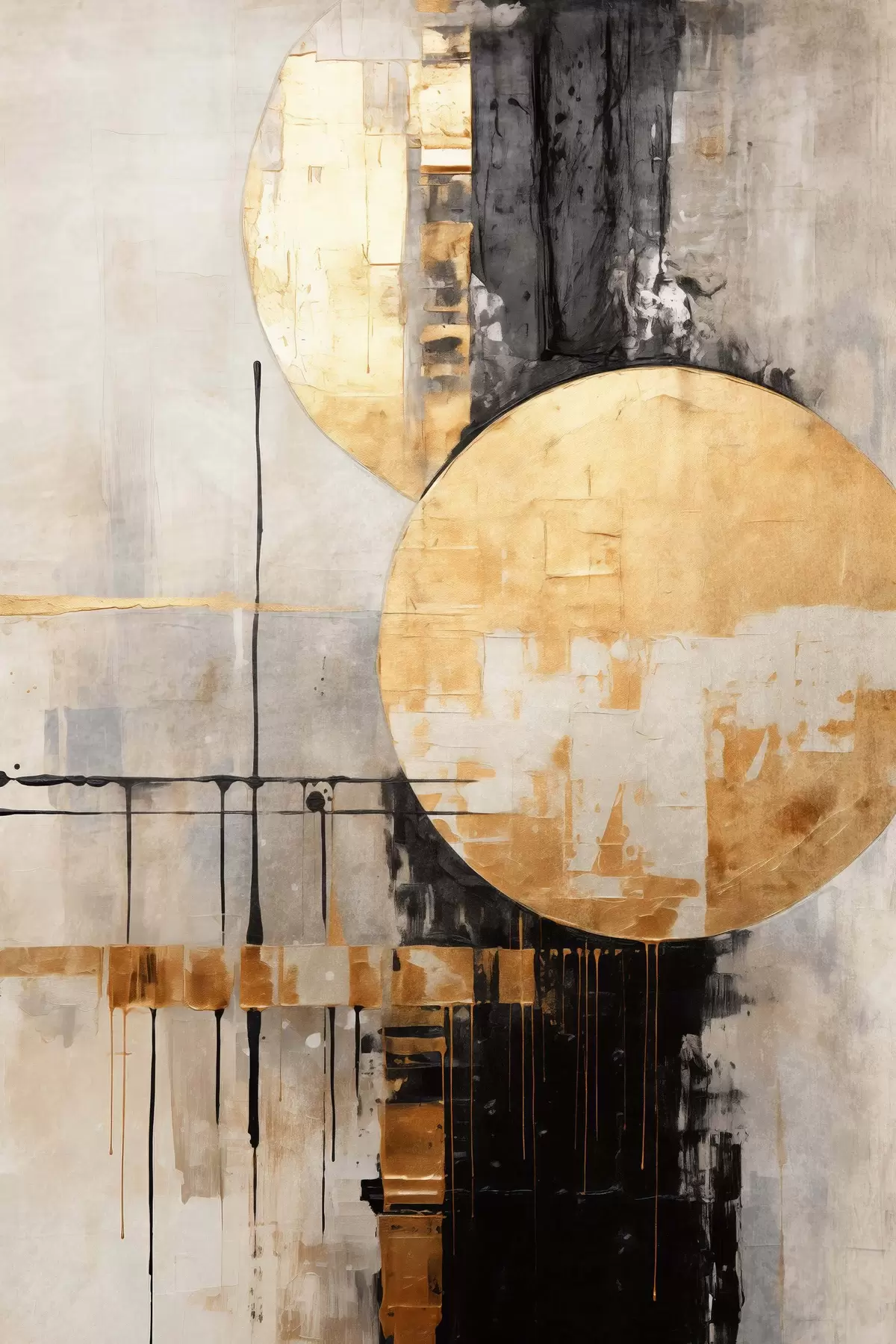 Glezna Abstrakta glezna ar apļiem, melnām un dzeltenām līnijām un fonu ar pelēkiem un baltiem toņiem s45185