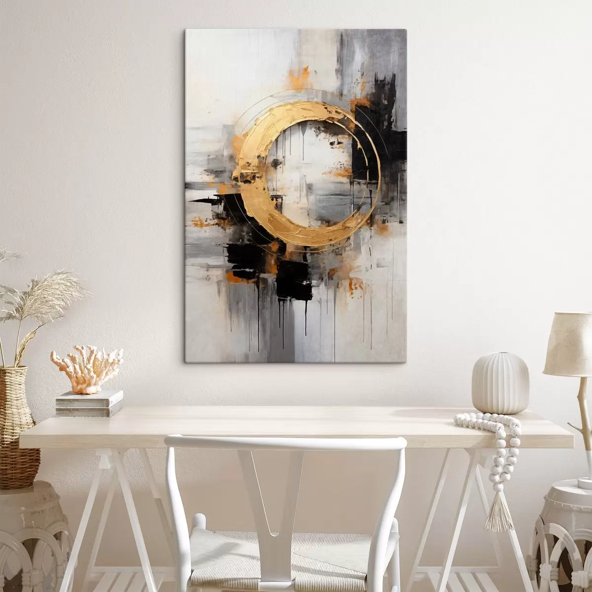 Glezna Abstrakta glezna ar apļiem, melnām un dzeltenām līnijām un fonu ar pelēkiem un baltiem toņiem s45186