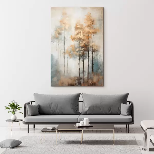 Glezna Teksturēti augsti koki ar dzeltenām lapām mežā , fons ir maigu zilu un brūnu toņu sajaukums Nr s45187