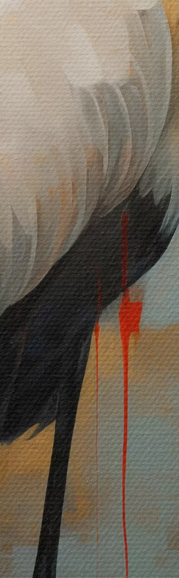 Glezna Balts gārnis uz dzeltenas, brūnas un zilas krāsas fona, kas atgādina miglainu, abstraktu ainavu Nr s45191