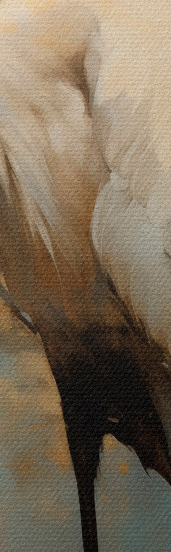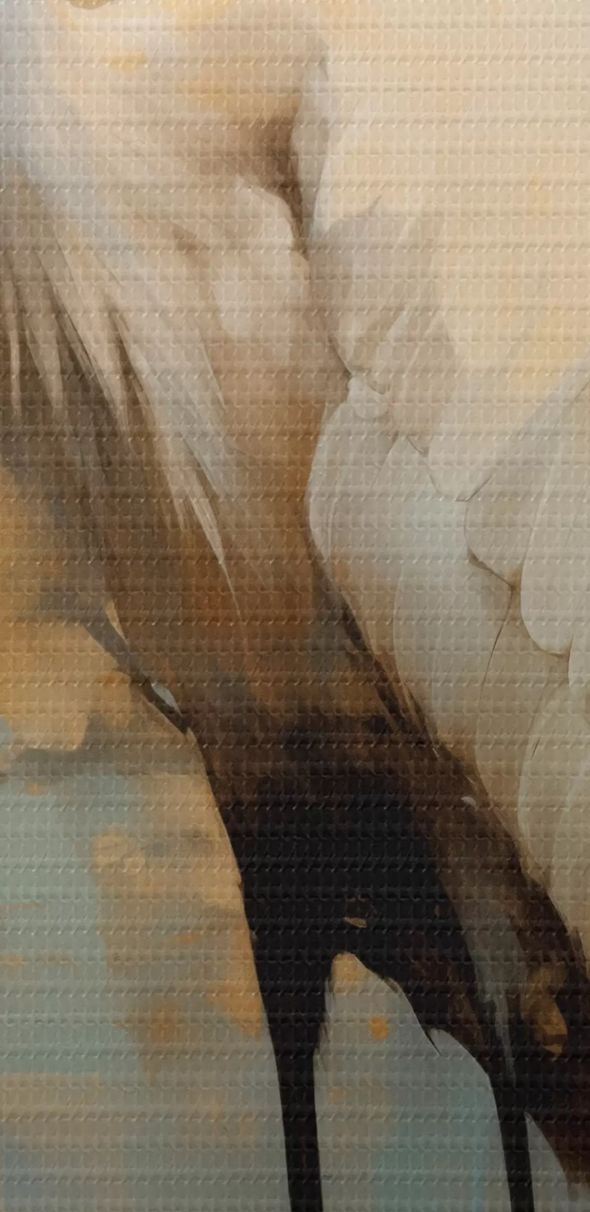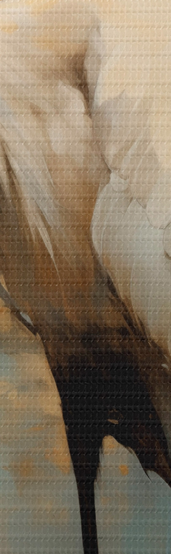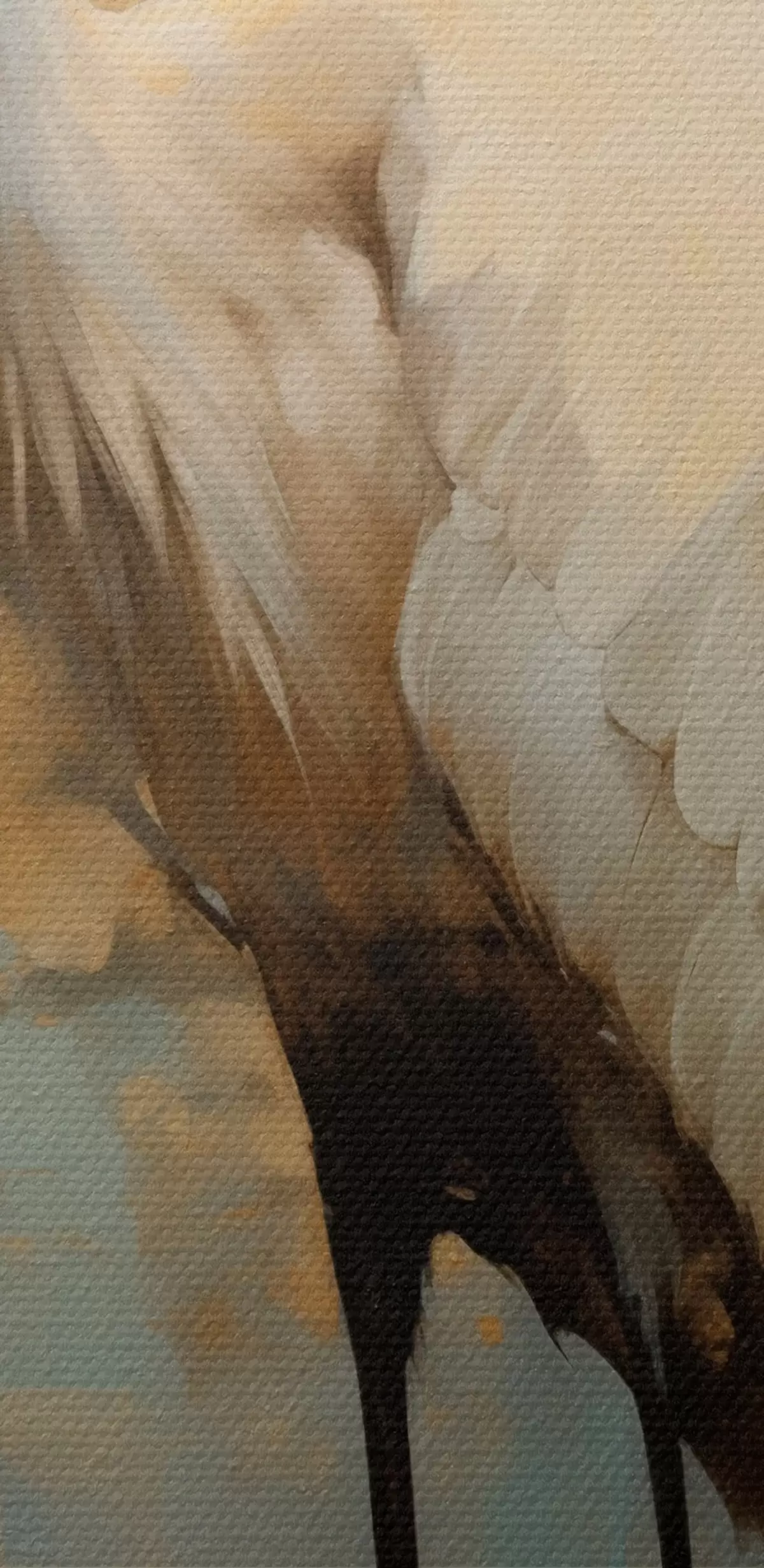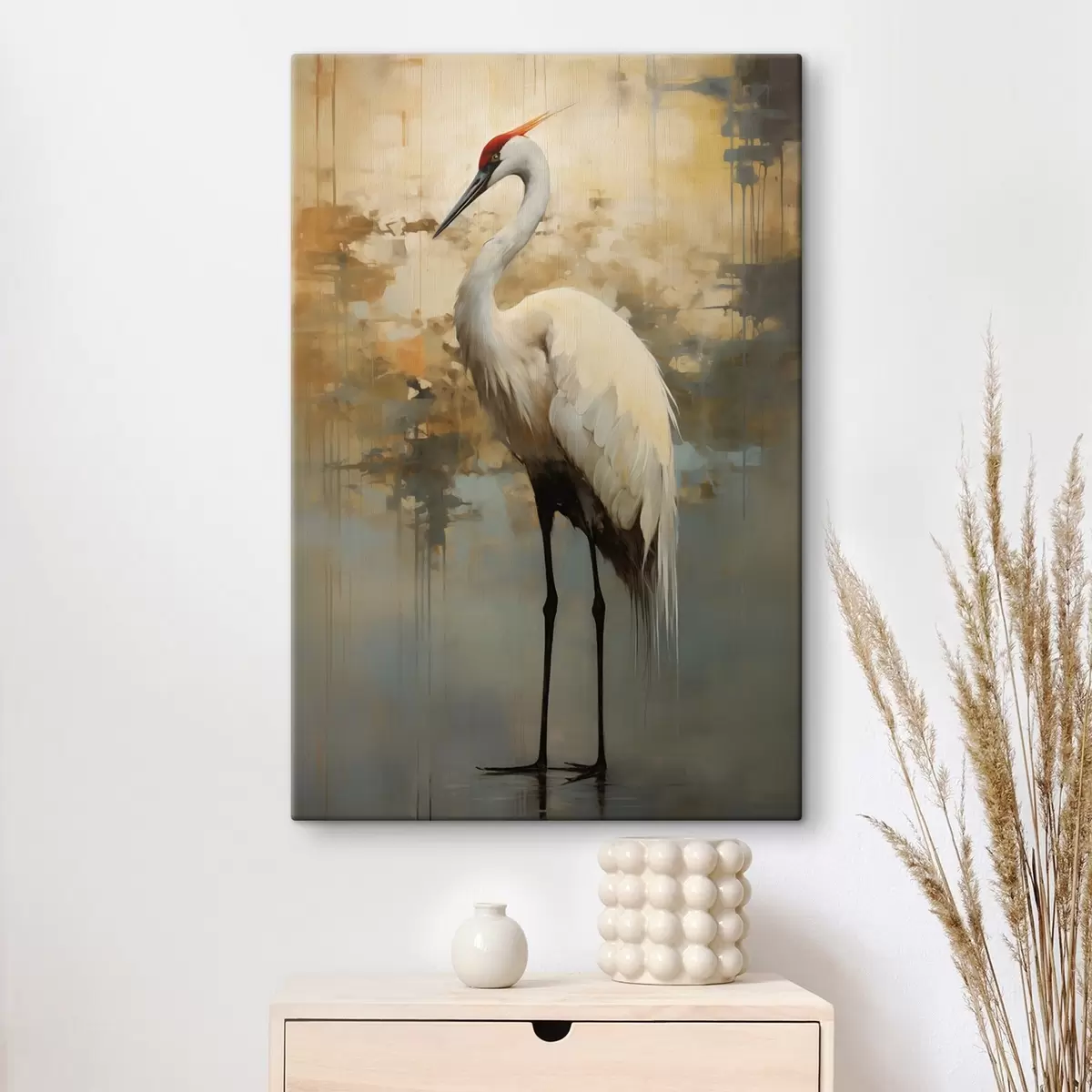 Glezna Balts gārnis uz dzeltenas, brūnas un zilas krāsas fona, kas atgādina miglainu, abstraktu ainavu Nr s45192