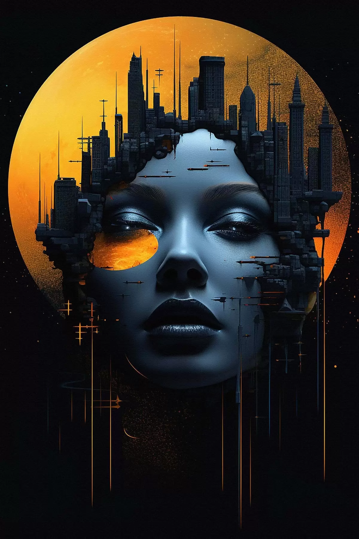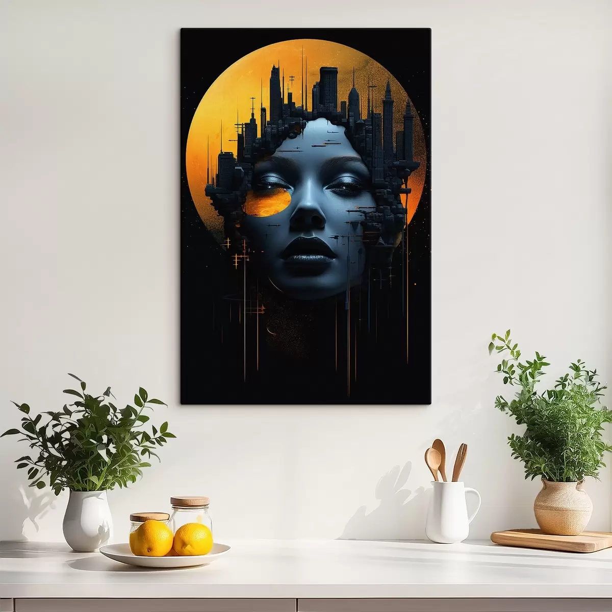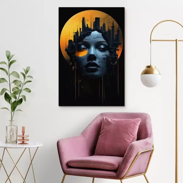 Glezna Cilvēki, meitenes seja uz pilsētas fona, abstrakts Nr s45341
