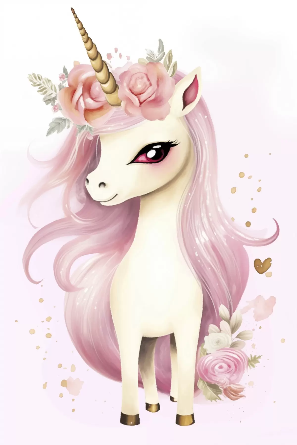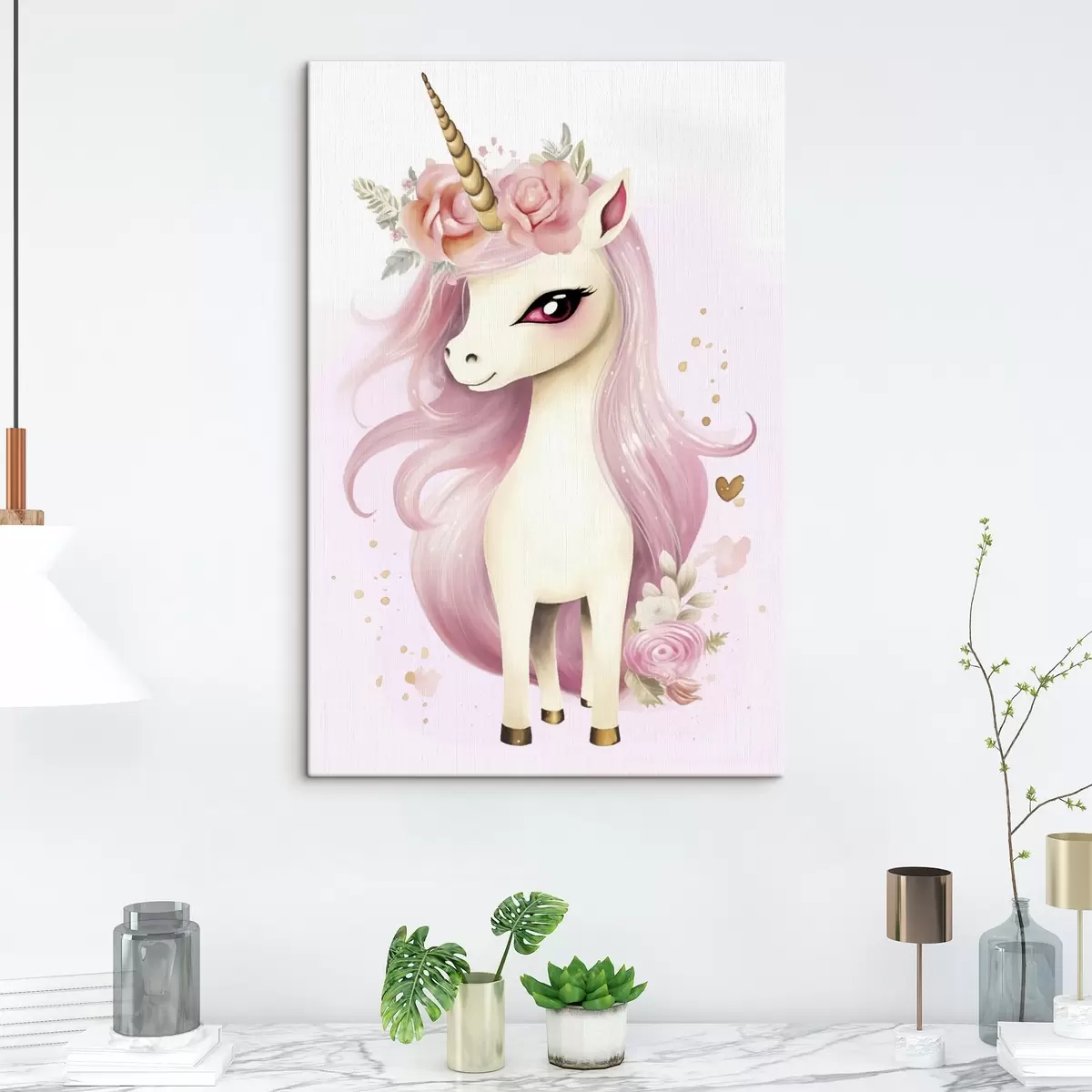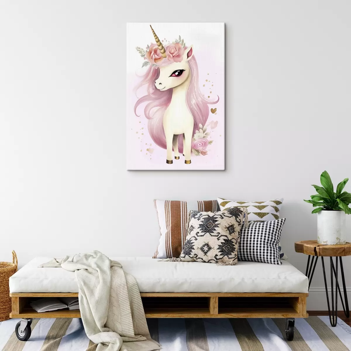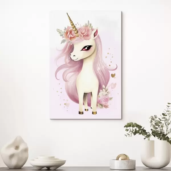 Glezna Vienradzis ar rozā grivu un ziedu vainagu s45484