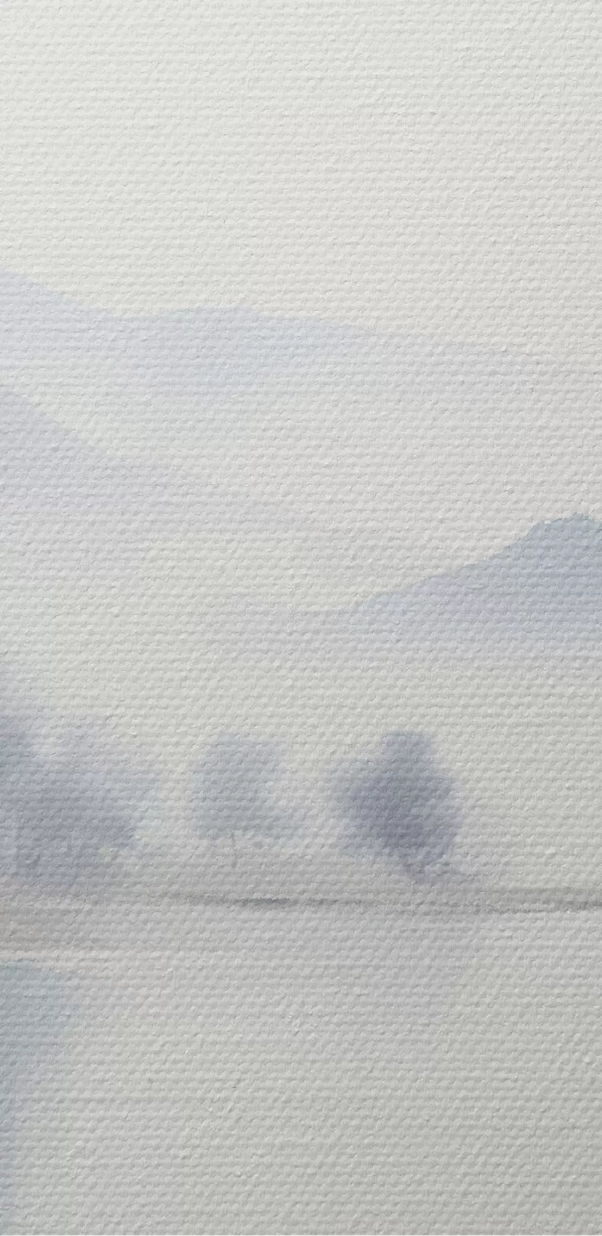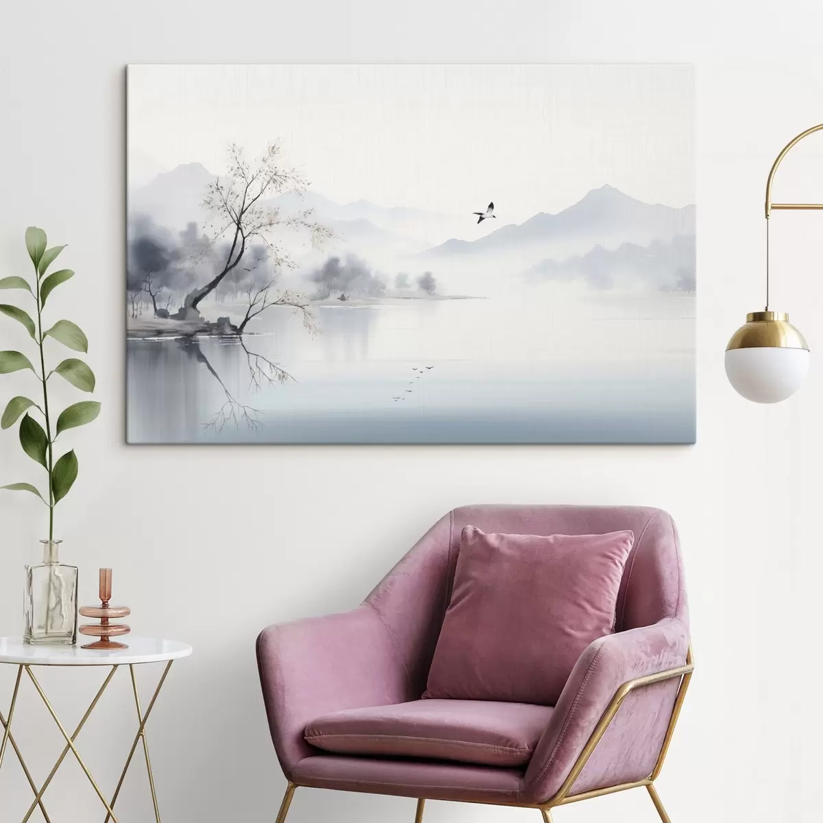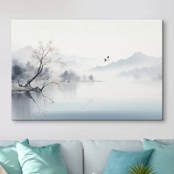 Glezna Miglaina ainava ar koku, kalniem un putniem Nr s45518