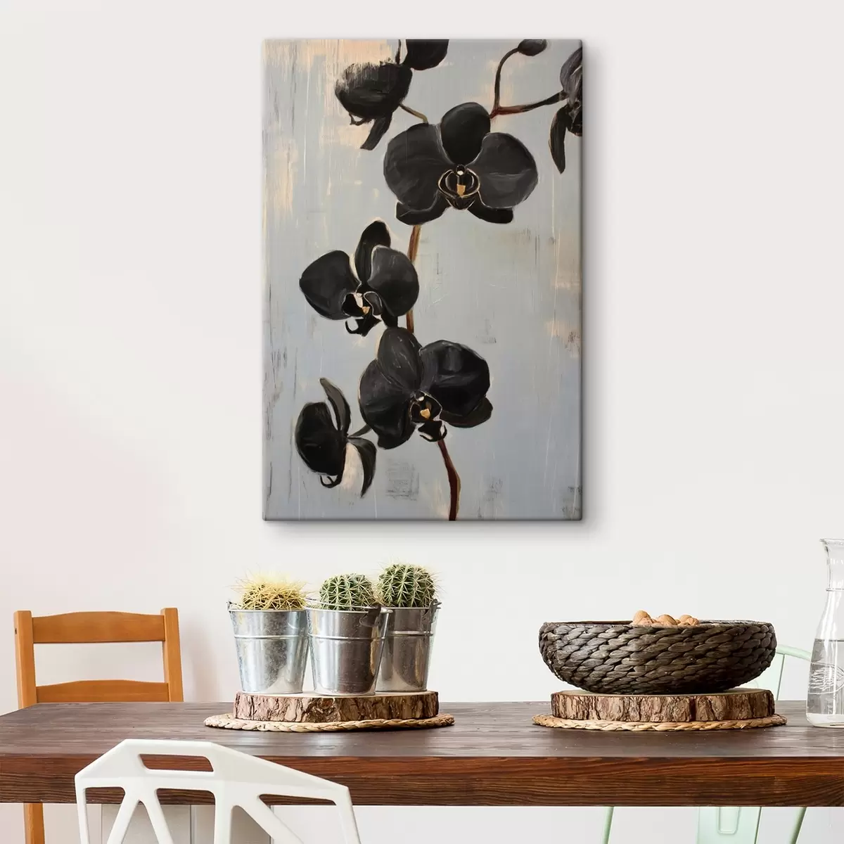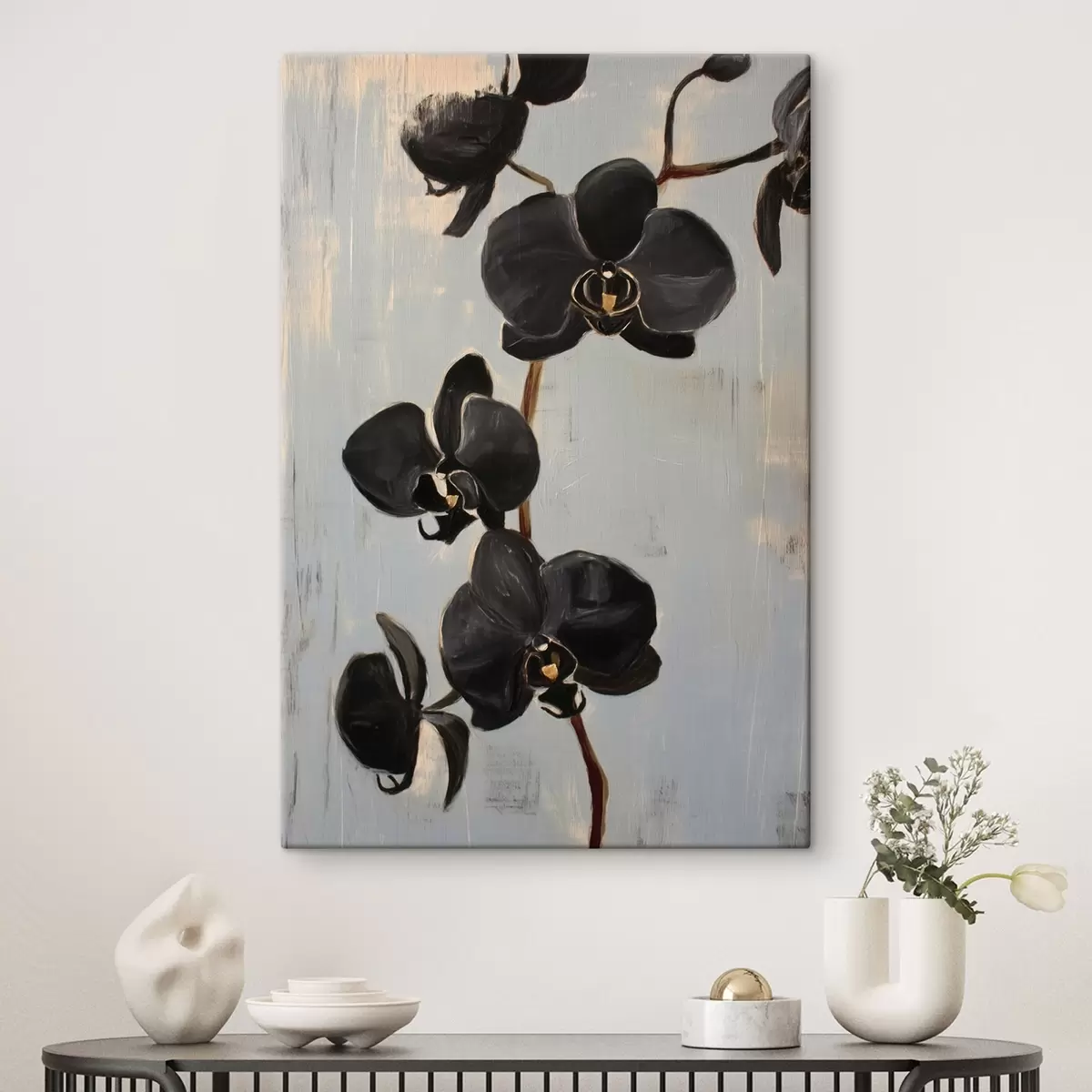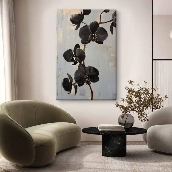 Glezna Dekoratīvās orhidejas: melni ziedi uz pelēka fona s45547