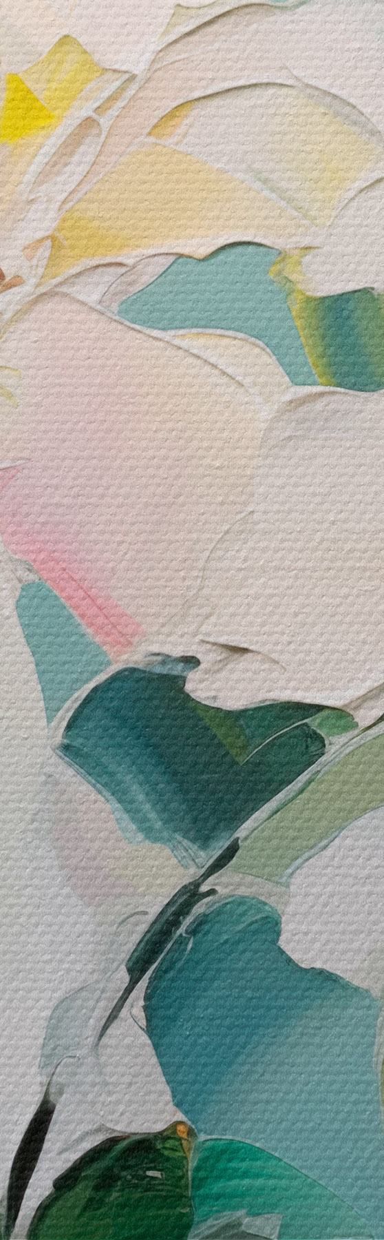 Glezna Ziedi ar krāsainiem akcentiem, zaļas lapas, mīksti triepieni ar otu, eļļas glezna imitācija, gaiši zils fons Nr s45549