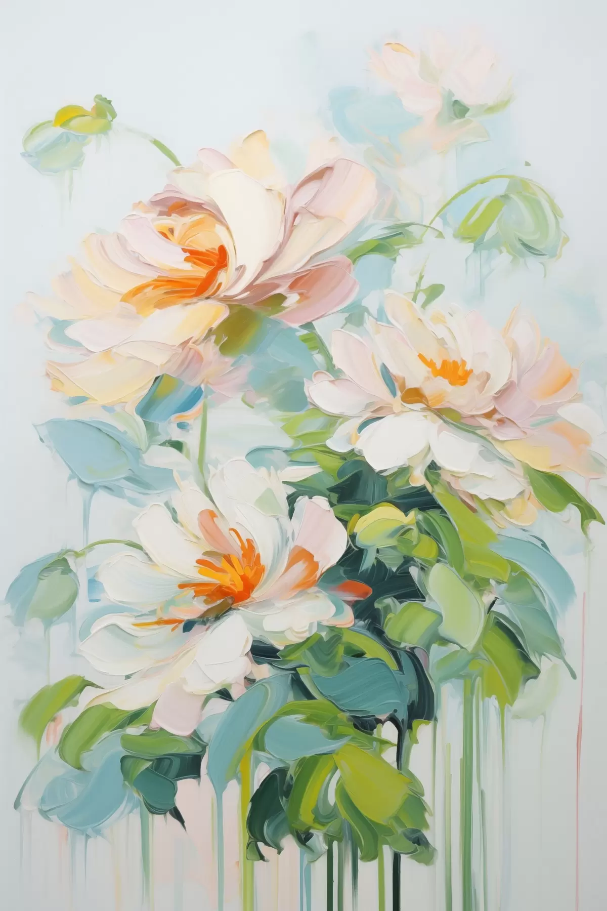 Glezna Balti un pasteļkrāsas persiku ziedi, zaļas lapas, mīksti triepieni ar otu, eļļas glezna imitācija, gaiši zils fons Nr s45550