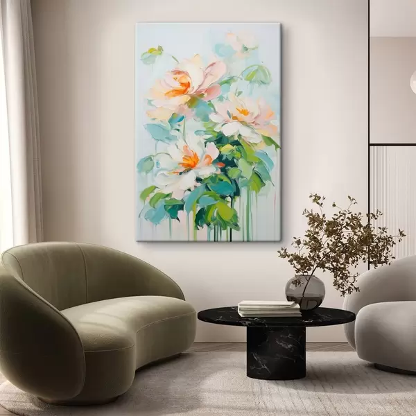 Glezna Balti un pasteļkrāsas persiku ziedi, zaļas lapas, mīksti triepieni ar otu, eļļas glezna imitācija, gaiši zils fons Nr s45550
