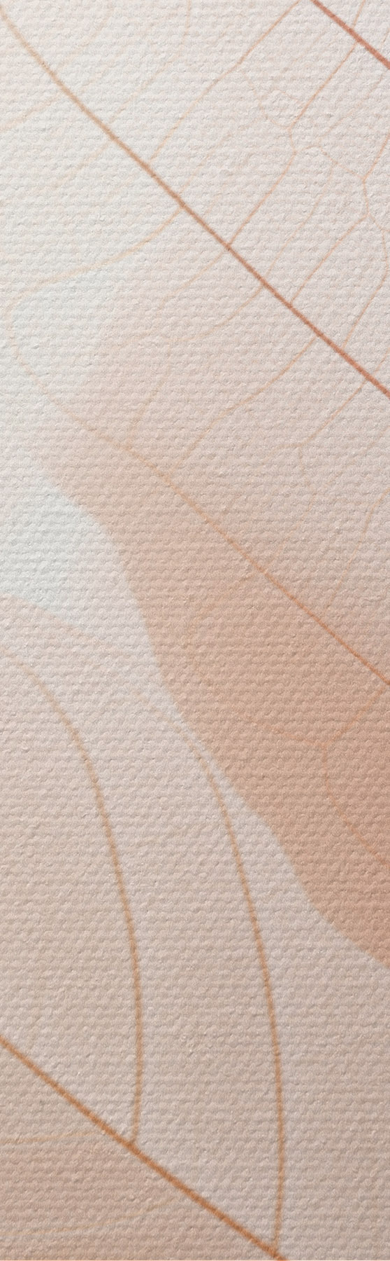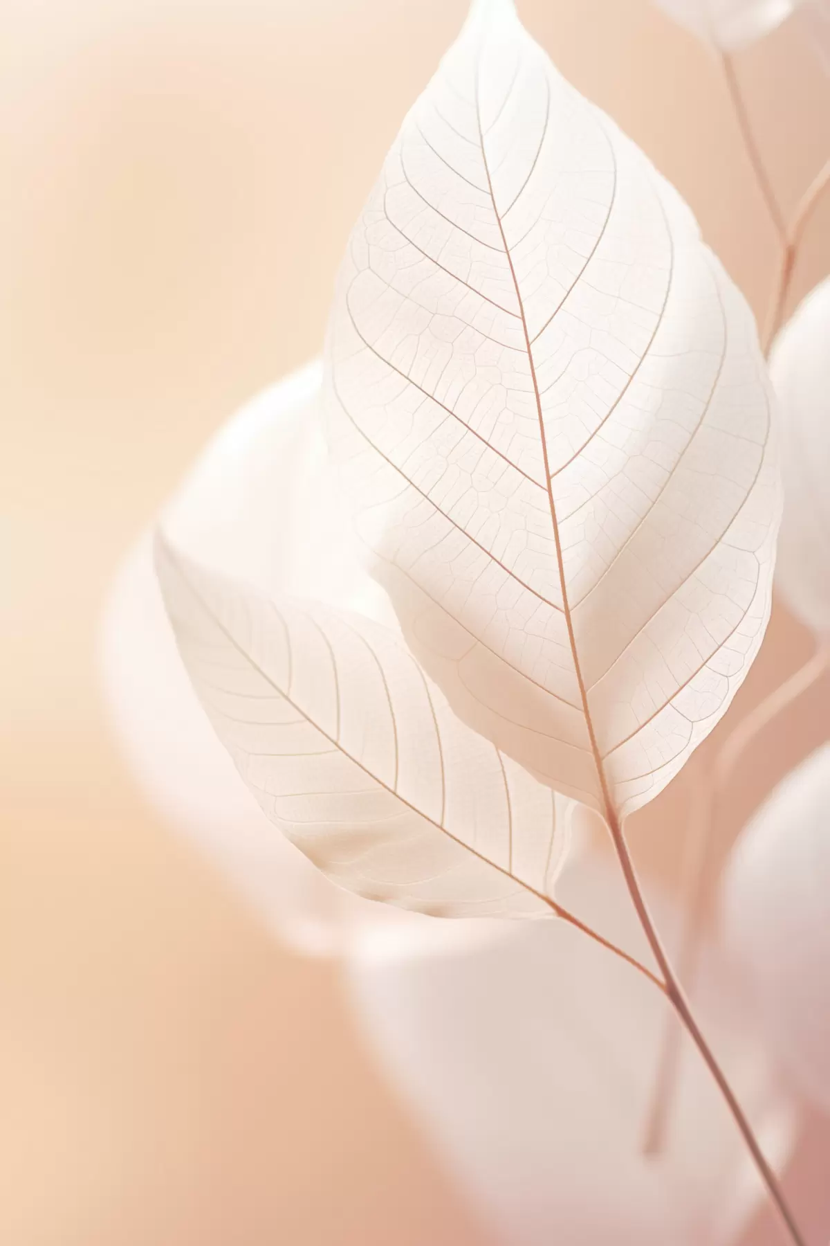 Glezna Smalki caurspīdīgas lapas ar sarežģītiem dzīslu rakstiem, maigs persiku fons, minimālistiska botāniska kompozīcija Nr s45555