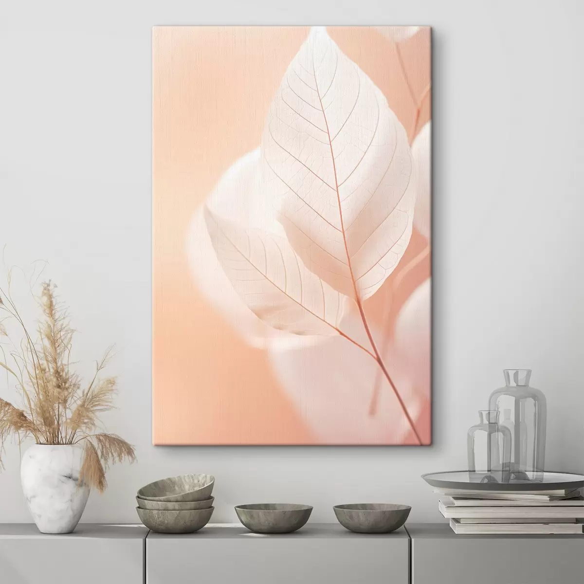 Glezna Smalki caurspīdīgas lapas ar sarežģītiem dzīslu rakstiem, maigs persiku fons, minimālistiska botāniska kompozīcija s45555