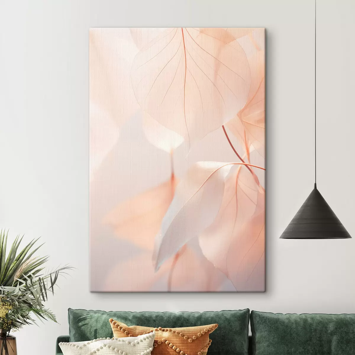 Glezna Puscaurspīdīgu lapu tuvplāns ar maigām dzīslām, maiga persiku un balta krāsu palete, neskaidrs fons Nr s45556