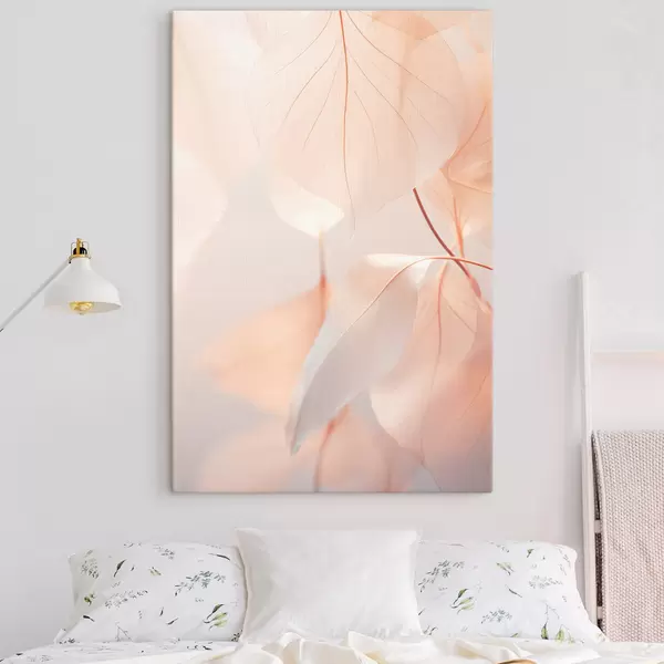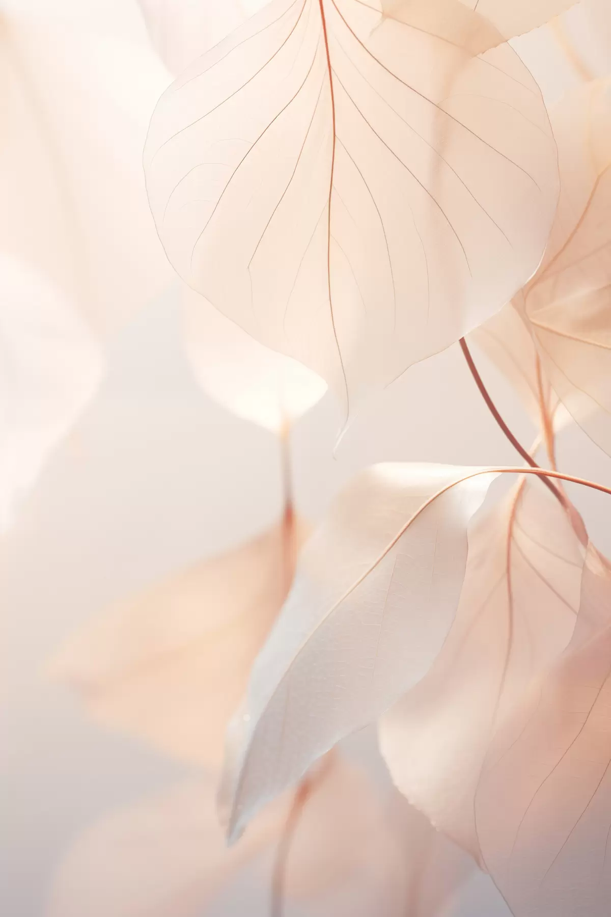 Glezna Puscaurspīdīgu lapu tuvplāns ar maigām dzīslām, maiga persiku un balta krāsu palete, neskaidrs fons Nr s45556