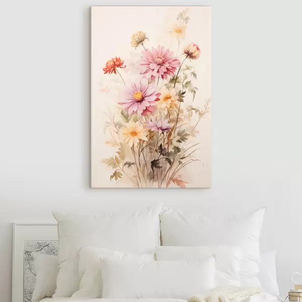 Glezna Krāsainu ziedu pušķis, mīksts akvareļu stils, uz gaiša fona, botāniska ilustrācija  s45560