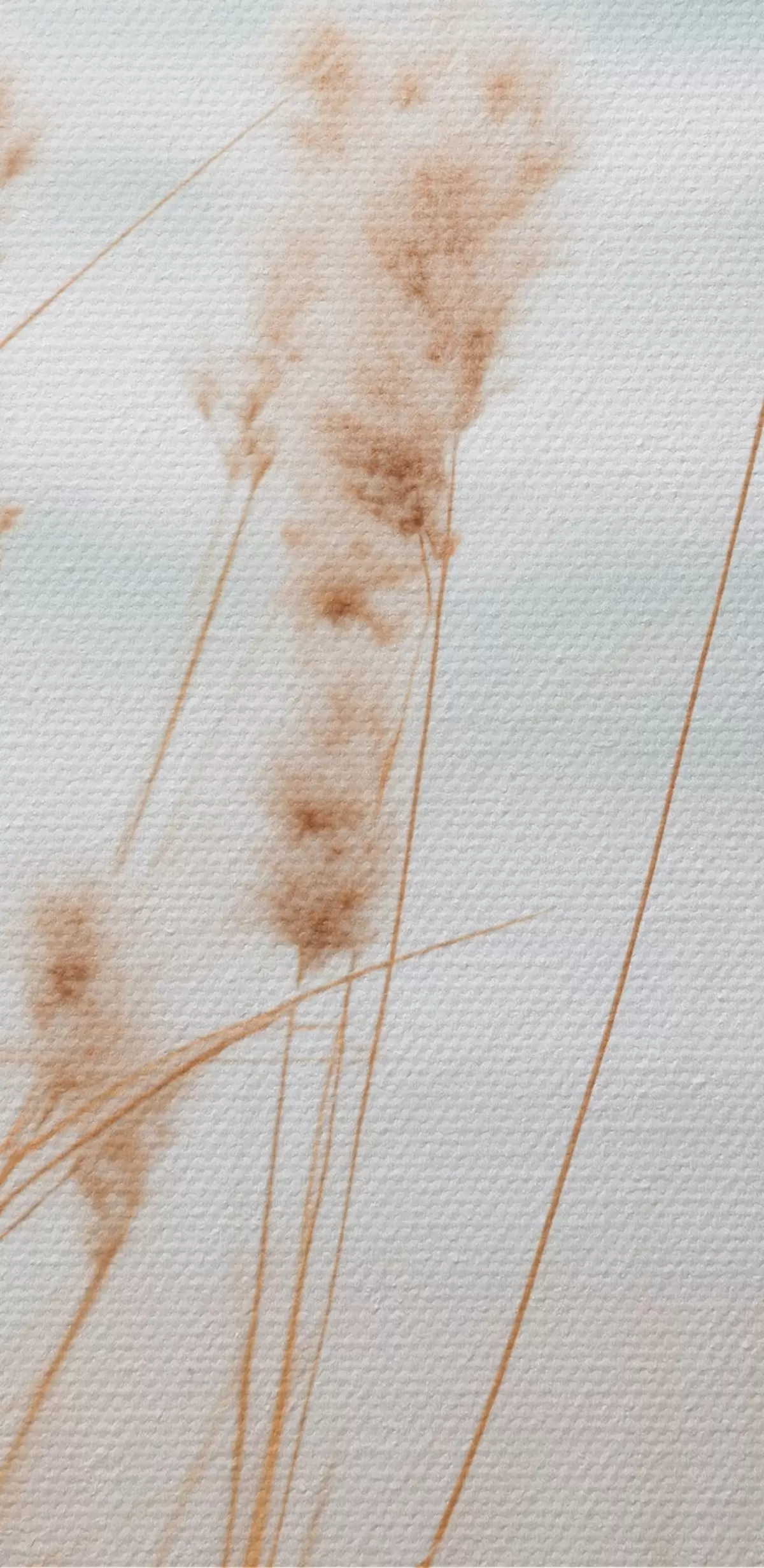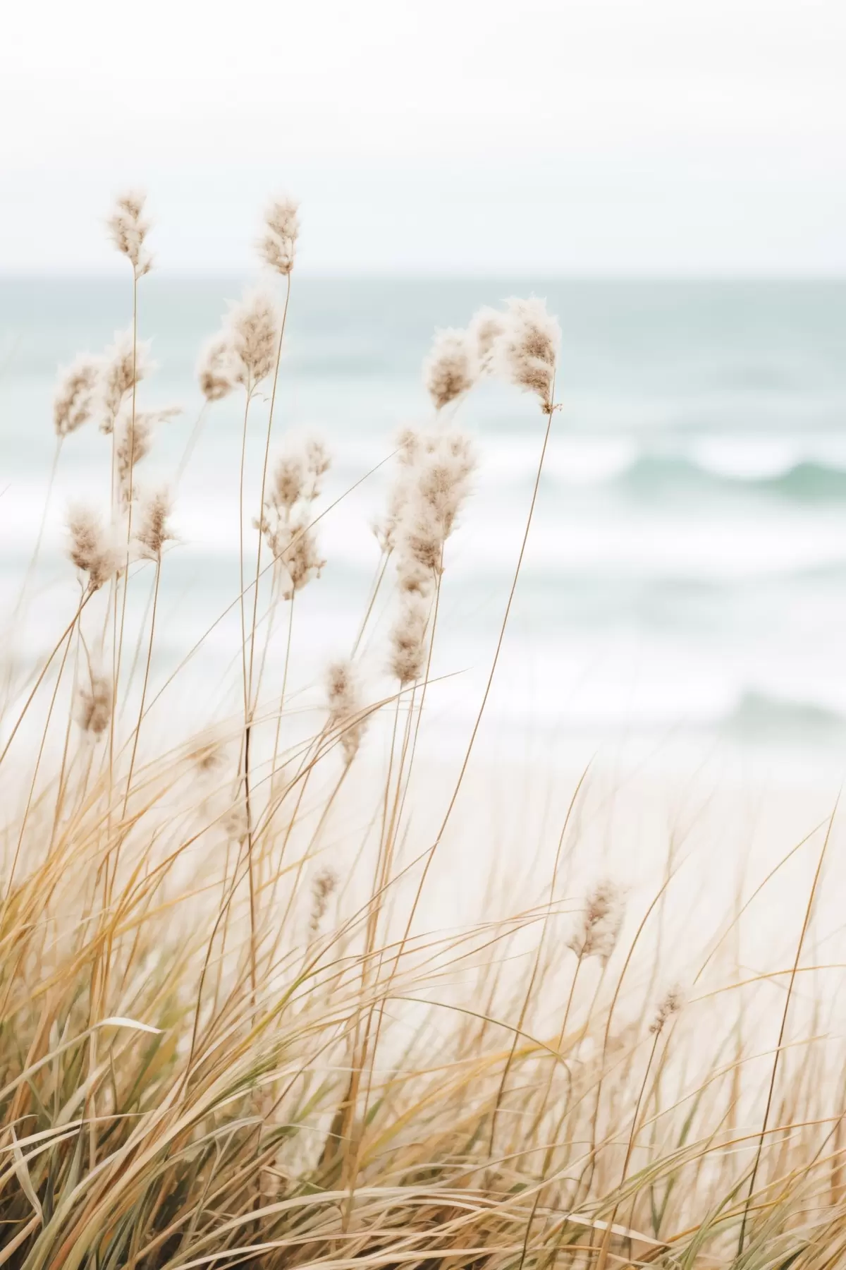 Glezna Augsta zāle ar pūkainām sēklu galviņām, smilšaina pludmale un okeāna viļņi fonā, maiga un pieklusināta krāsu palete Nr s45561