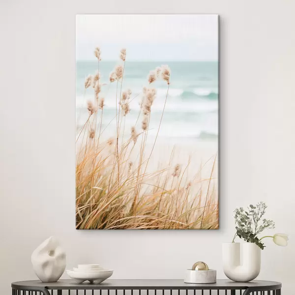 Glezna Augsta zāle ar pūkainām sēklu galviņām, smilšaina pludmale un okeāna viļņi fonā, maiga un pieklusināta krāsu palete Nr s45561