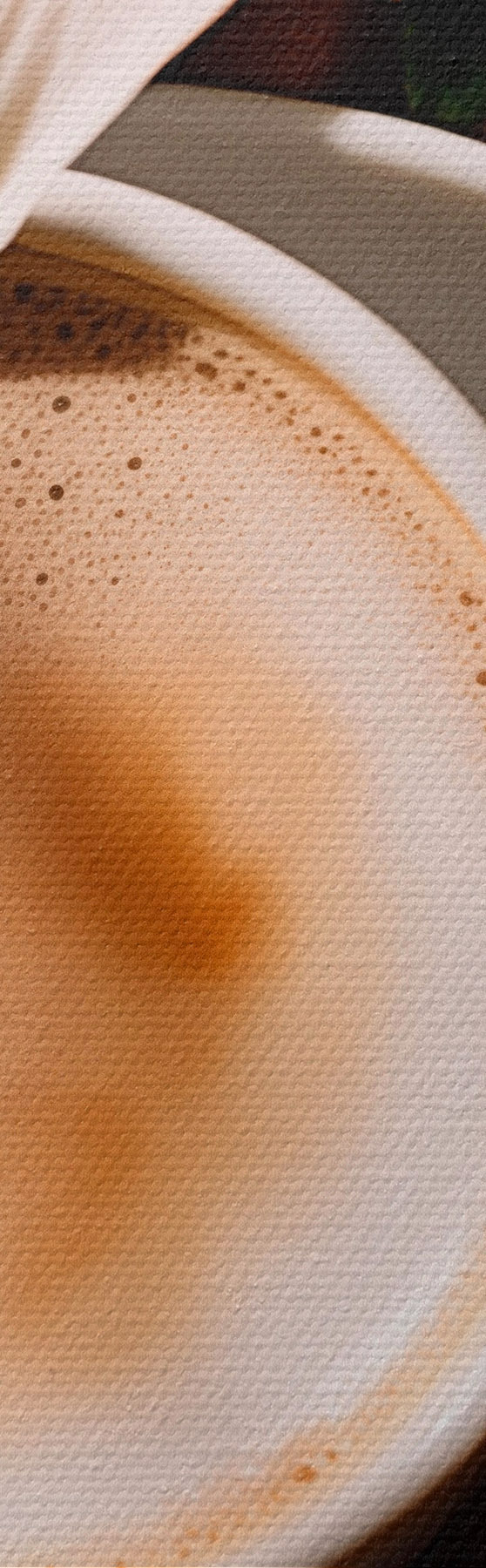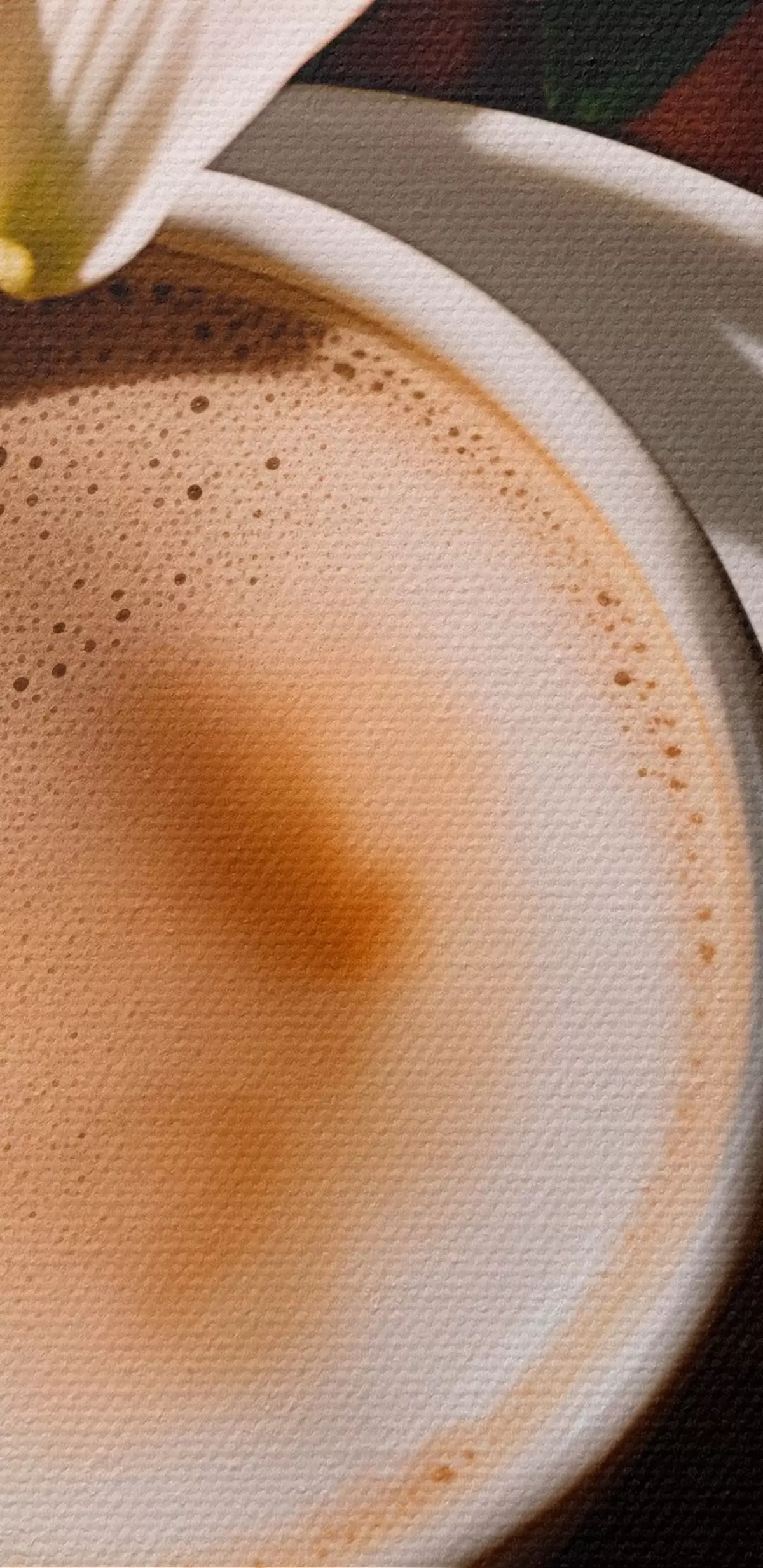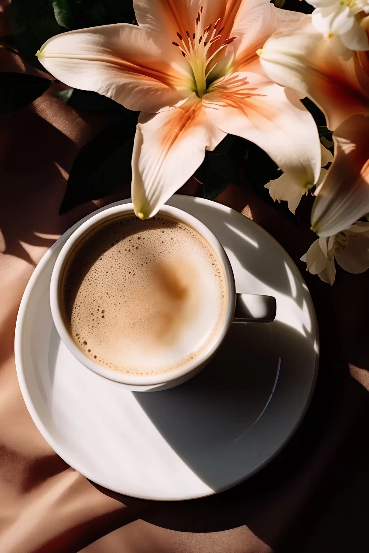 Glezna Kafijas tasīte ar putām uz balta šķīvja, daži ziedi fonā, ar saules gaismu s45569