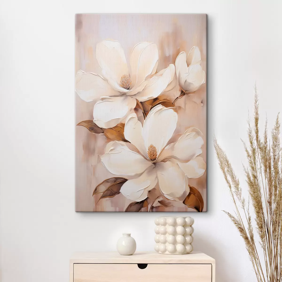 Glezna Balti magnolijas ziedi uz mīksta, izplūduša bēša un brūna toņu fona, glezniecības stilā Nr s45572