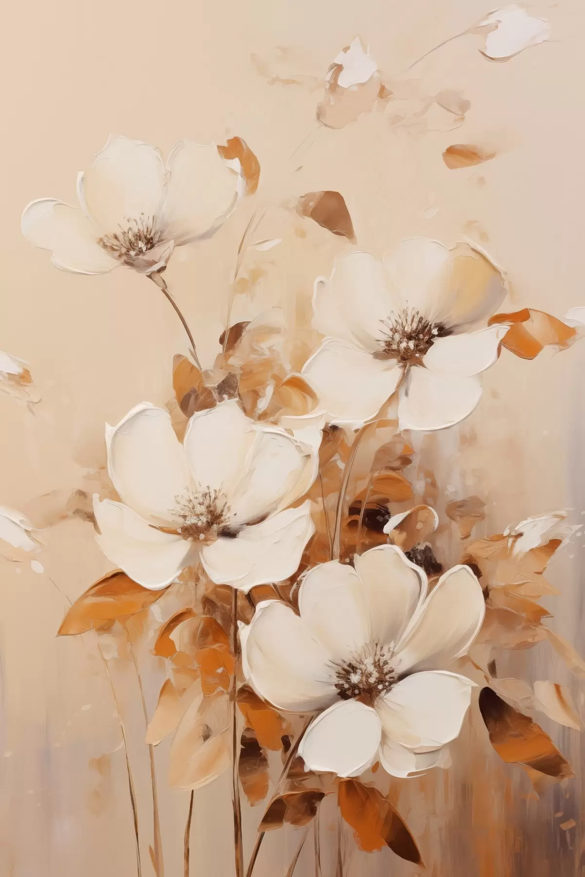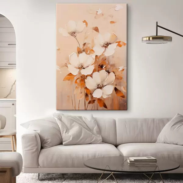 Glezna Balti ziedi ar oranžām lapām, maigi triepieni, silta krāsu palete, eleganta kompozīcija Nr s45573