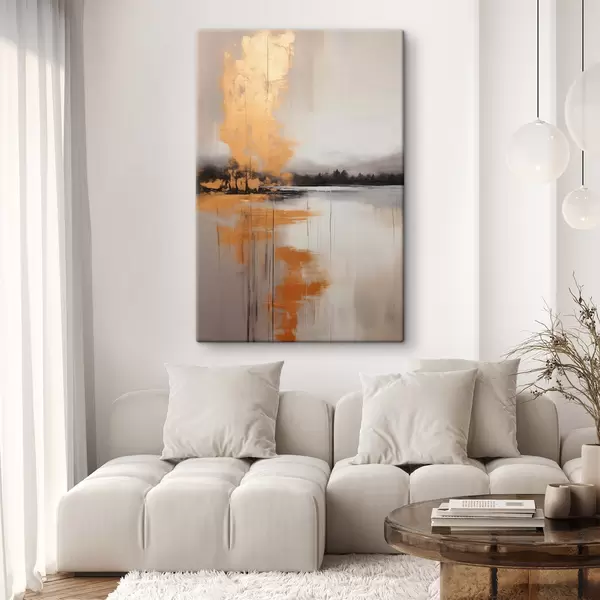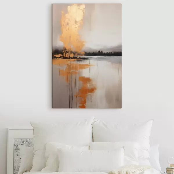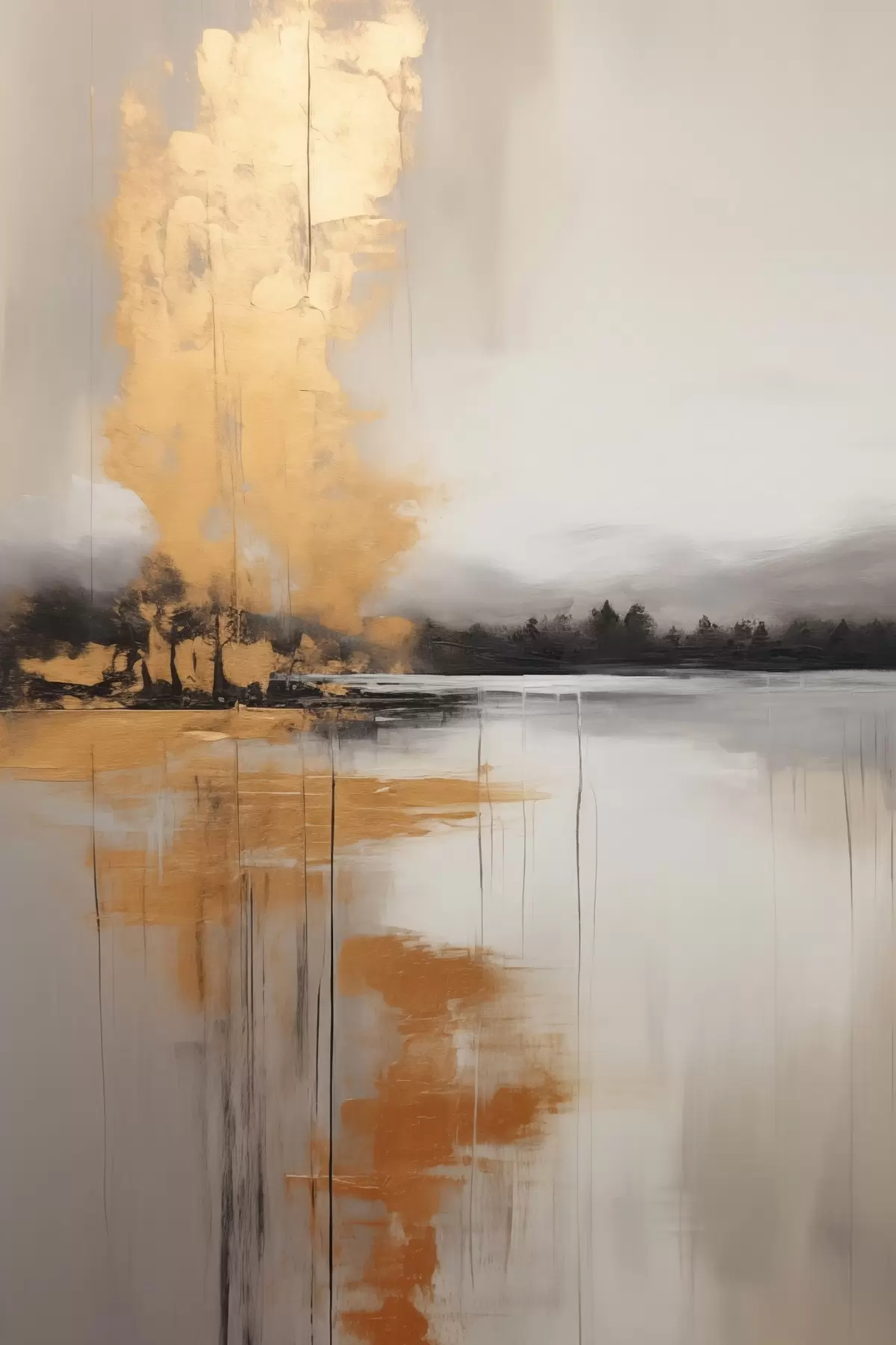 Glezna Abstrakta ainava ar ezeru, koku un dzeltenu miglu , ūdens atspoguļo un mākoņainas debesis s45575